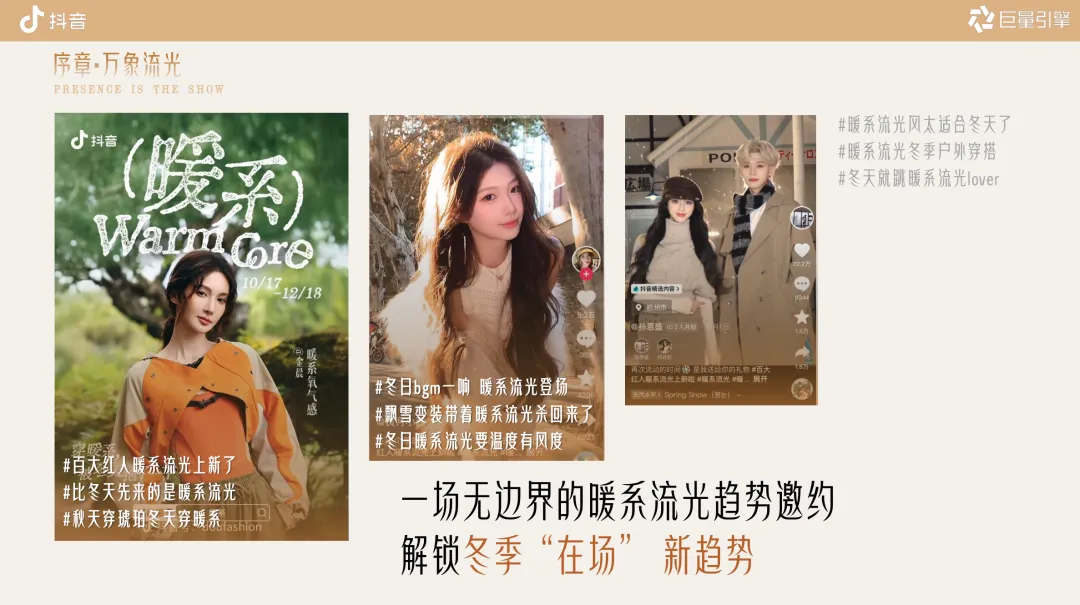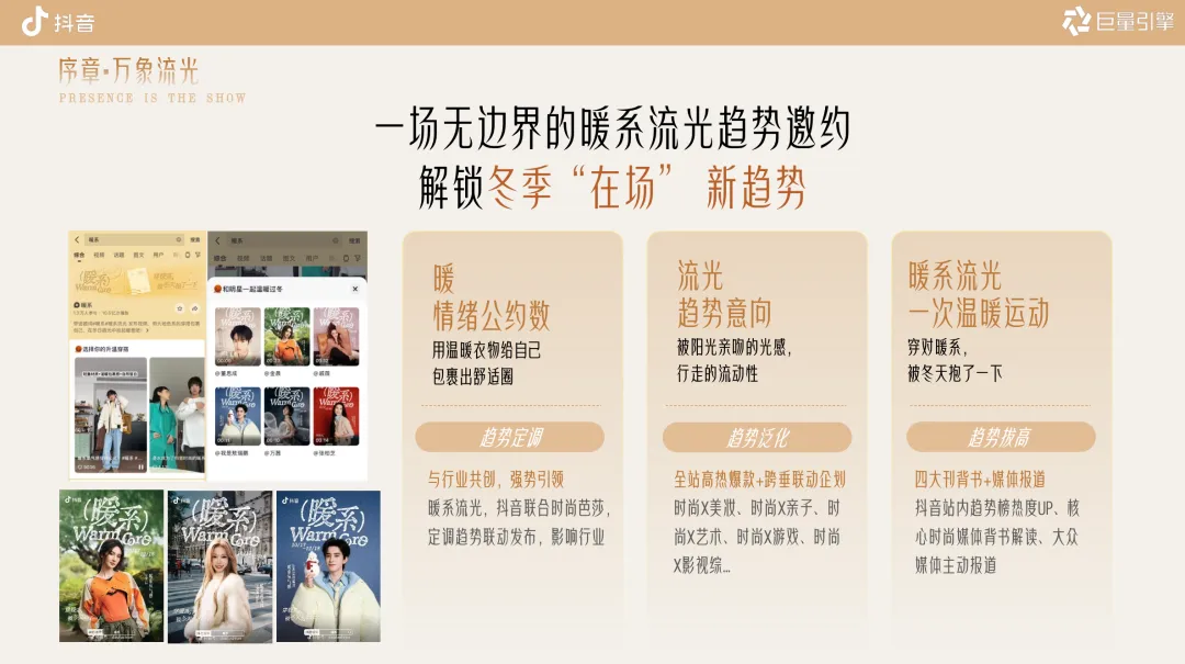 序章・万象流光(趋势定调)‑ 联合《时尚芭莎》发布暖系流光趋势;明星/达人共创话题 #暖系流光风太适合冬天了#‑ 平台资源:抖音趋势榜、TopView、信息流、品牌专区