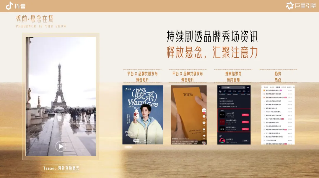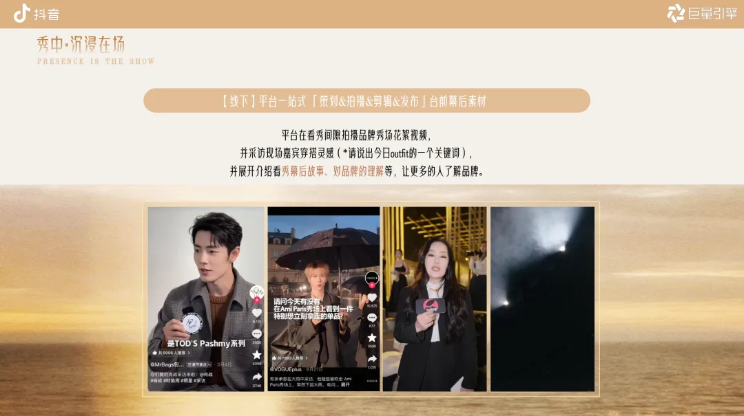 秀前・悬念在场(预热蓄水)‑ 趋势预告短片+直播预约组件;线下“在场空间”随机街拍快问快答‑ 搜索拦截:品牌专区+预约按钮;达人征集粉丝想看 Look