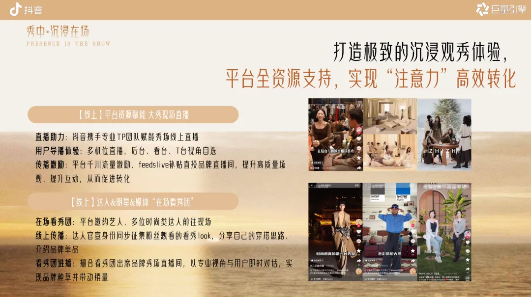中文在场即秀场、抖音暖系流光、2025抖音时尚IP、线上秀场新范式、暖系流光冬季穿搭、在场看秀团、抖音feedslive大秀、明星多机位直播、时尚媒体背书合作、UGC穿搭挑战赛、品牌专区+直播组件、抖音趋势定调、暖系流光曝光110亿、秀场名场面二创、四大刊时尚背书、抖音TopView秀场、短视频秀场转化闭环