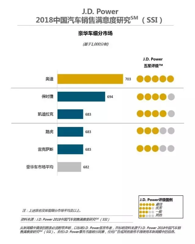 近日,J.D. Power 发布了2018中国汽车销售满意度研究(SSI)与2018中国消费者汽车金融销售满意度研究(CFS)。奥迪以703分连续第六年位居豪华车细分市场销售满意度榜首。