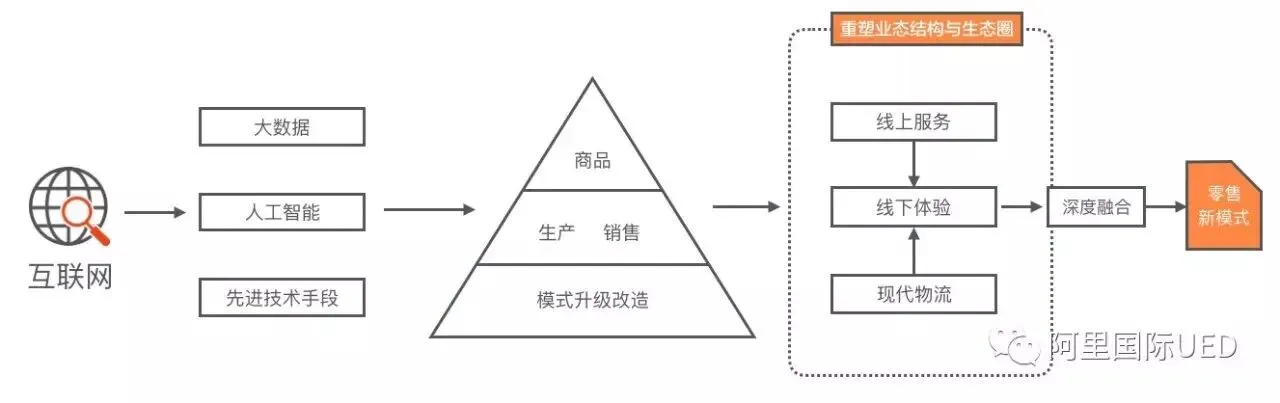 新零售百度定义:即企业以互联网为依托,通过运用大数据、人工智能等先进技术手段,对商品的生产、流通与销售过程进行升级改造,进而重塑业态结构与生态圈,并对线上服务、线下体验以及现代物流进行深度融合的零售新模式。