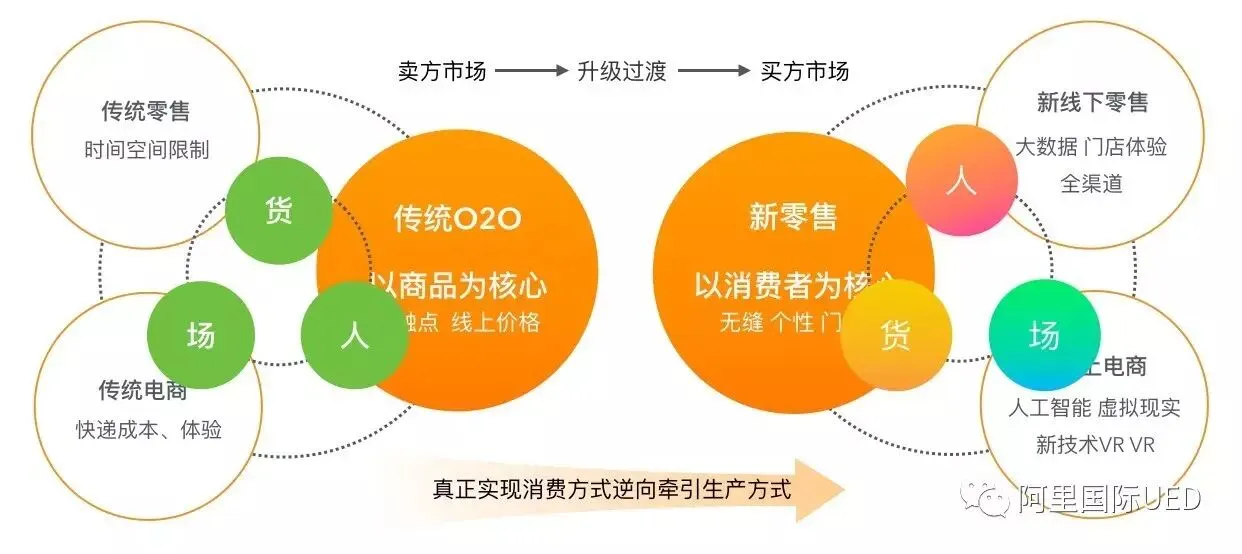 传统零售受空间地域限制,传统电商快递成本高、体验缺失,传统020以商品为核心触点单一,多以线上价格。新线下零售利用大数据,增加门店全渠道购物体验,线上电商采用人工智能,虚拟现实新技术应用,强调以消费者为核心,无缝且个性化体验。传统零售到新零售,真正从卖方市场升级过度到买方市场,实现消费方式逆向牵引生产方式。
