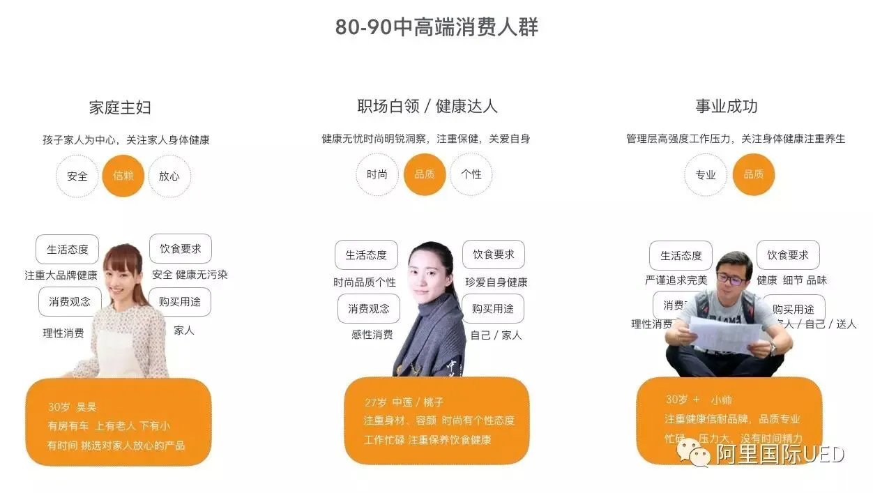 通过前期市场调研走访,业务大环境趋势分析,竞品分析数据汇总,发现女性用户便高于男性,卡片分类,维度:用户痛点、使用场景、行为动机整理;体验层:从购物链路、行为触点分析。确定我们的精准目标人群为80-90后中高端消费人群,有从生活态度,饮食要求,消费观念,购买用途进行对比分析。