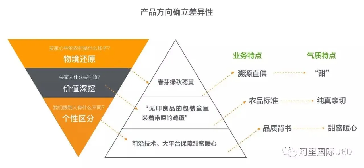 1. 物境还原:买家心中农村是什么样子?2. 价值深挖:买家为什么买村货?3. 个性区分:我们跟别人有什么不同?层层分析确立业务特点与气质特点、产品差异。