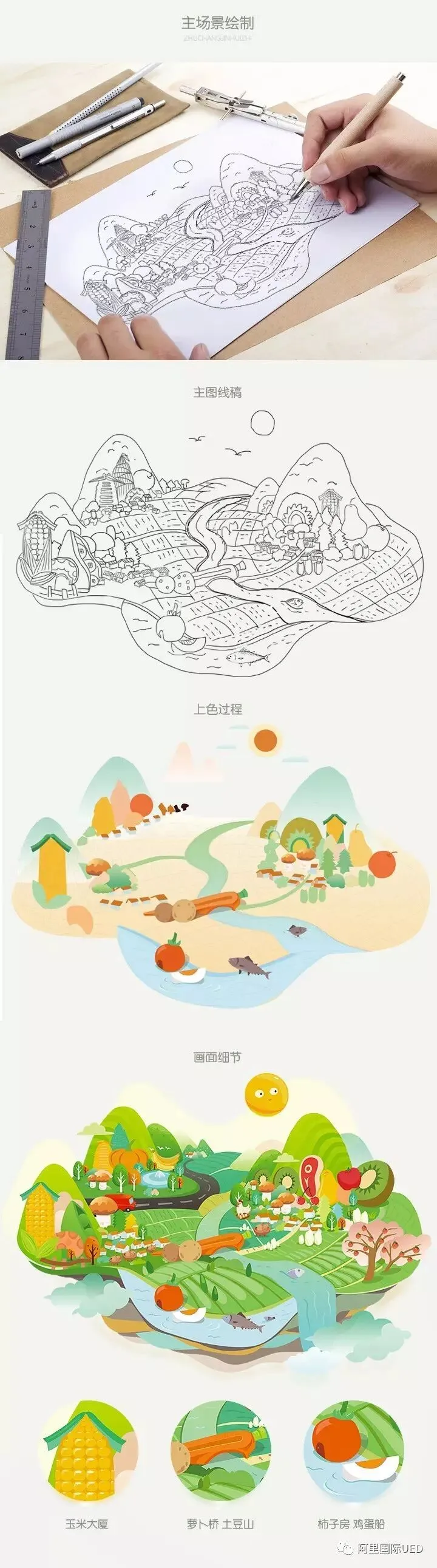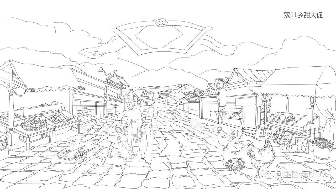 设计核心思路能够透传出品牌的核心理念“自然源味 食必求真”,在此次形象升级中能够充分体现出产品“以品为核心”特质,传递安全感与信赖感。满足目标群体时尚而年轻,以田野、阳光、绿植、爆品建筑物为核心的自然生态元素,经过主观艺术加工概括成一简练的图形,构成一幅能够引起大家广泛共鸣画面,朝阳漫照乡野、老农放牧于田野之间,农作物正在惬意生长世外桃源。既富有亲和力,又富予更多想象和回味空间,传达出生态生产环境和淘乡甜追求真实、自然、淳朴的价值观。将主场景已有元素在分场景予以延展,在品牌延展和包装设计中推广应用,使其产品和品牌形象完美集合,加深消费者对淘乡甜的认知度。画面场景确立后,色彩选择上我们选用清新自然色系,画面质感采用扁平矢量风格便于后续各个渠道延展,人物造型选用简笔画体现淳朴原生态质感,通过一系列表示手法塑造在消费者心智。
