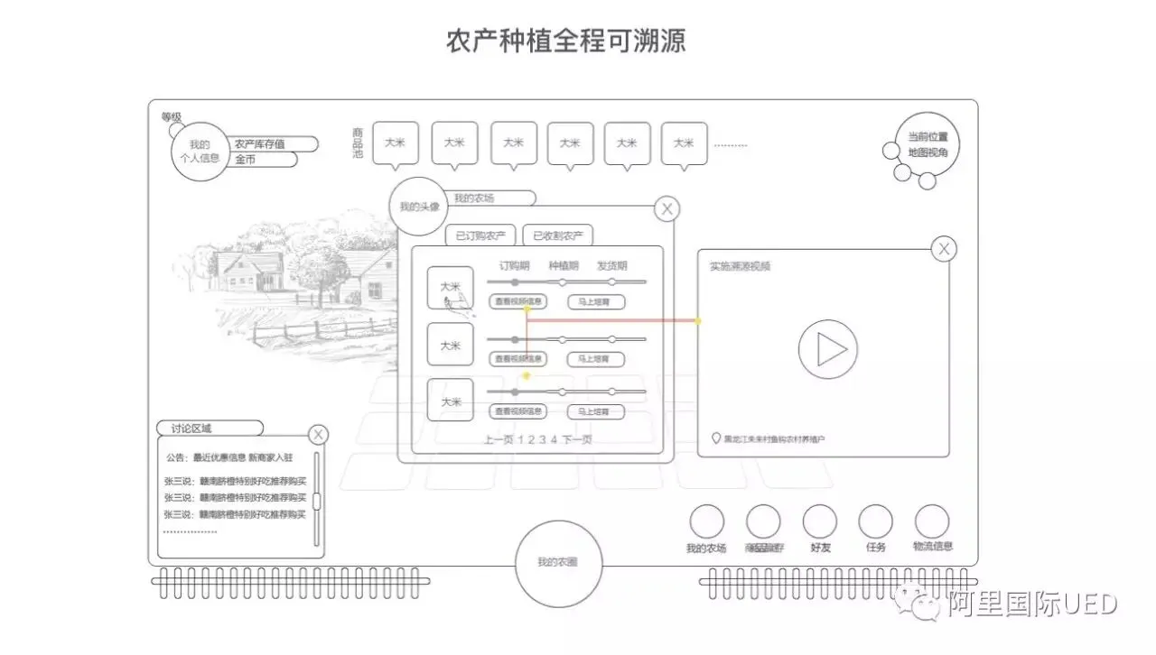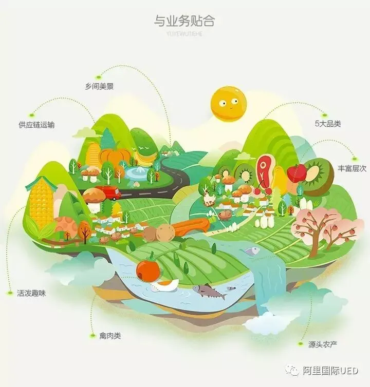 锁定业务特点跟确立产品方向后设计师要着手设计,脑爆关键词创意不断发散与聚拢,从农村种植场景视觉元素到农产品、农户种植形态特征、供应链渠道场景发散。