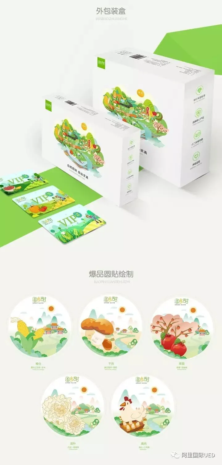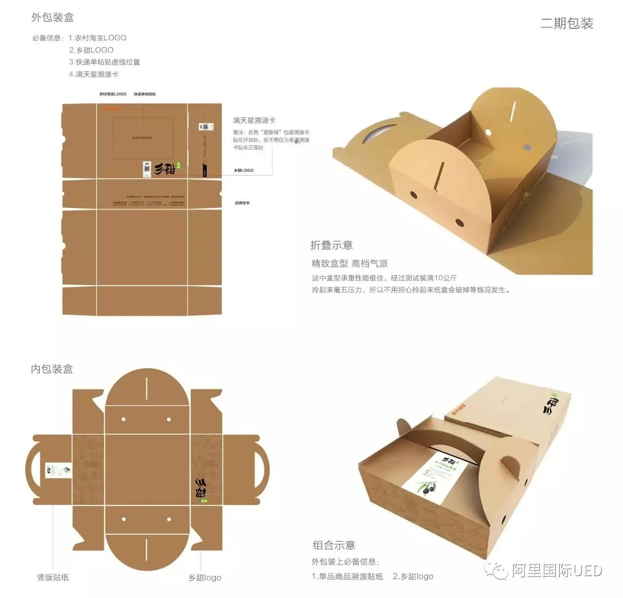 外包装箱历经三期,第一期联合运营阶段,联合当地知名农户经销产品采取贴牌,ued团队共建设计方案,选用一生三三生万物体系语言、简约设计风格应用贴纸凸显品牌跟品质;第二阶段独立运营,凸显乡甜品牌平台运营价值,采用统一乡甜外包装箱,明确设计元素与规范有了外包箱从0到1突破;第三阶段自主运营更改为淘乡甜品牌,统一所有品类一系列外包装箱,而第三期包装基础盒形市场部提供。规范及审核我们ued跟进产出,过程中与业务密切协同,梳理品类特质,选用不同合适盒型包装方案,奠定不同品类盒形规范基石,大大提升运营与商家沟通效率。