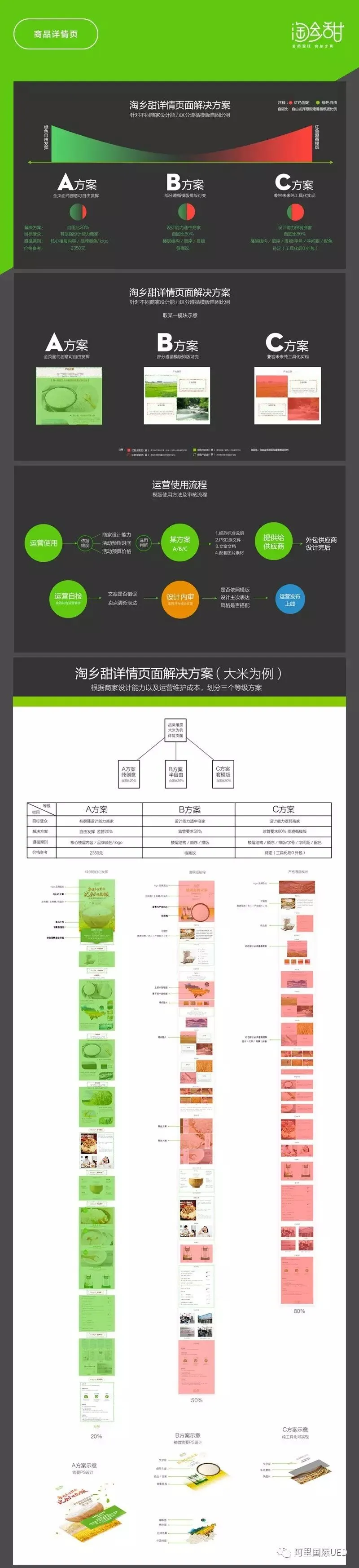 业务阶段划分为初创期、探索期、发展期、稳定期,在业务不同阶段运营节奏及要求不同,UED设计策略灵活应变。短平快高效高质支撑产出多样方案满足业务探索,到锁定业务方向后精确输出。业务定位品牌理念有打造具有中国特色品质农产品,到聚焦源头货源自然源味、食必求真理念,再到贴近城市人群健康生活就在你身边。一次次变革中设计方向不断调整满足业务诉求。