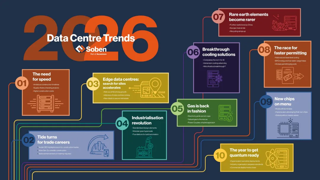 《2026 年数据中心行业趋势报告:全面提速》围绕行业发展现状、十大核心趋势、区域市场动态及 AI 在交付中的应用展开深度分析,勾勒出全球数据中心行业加速升级的发展图景。