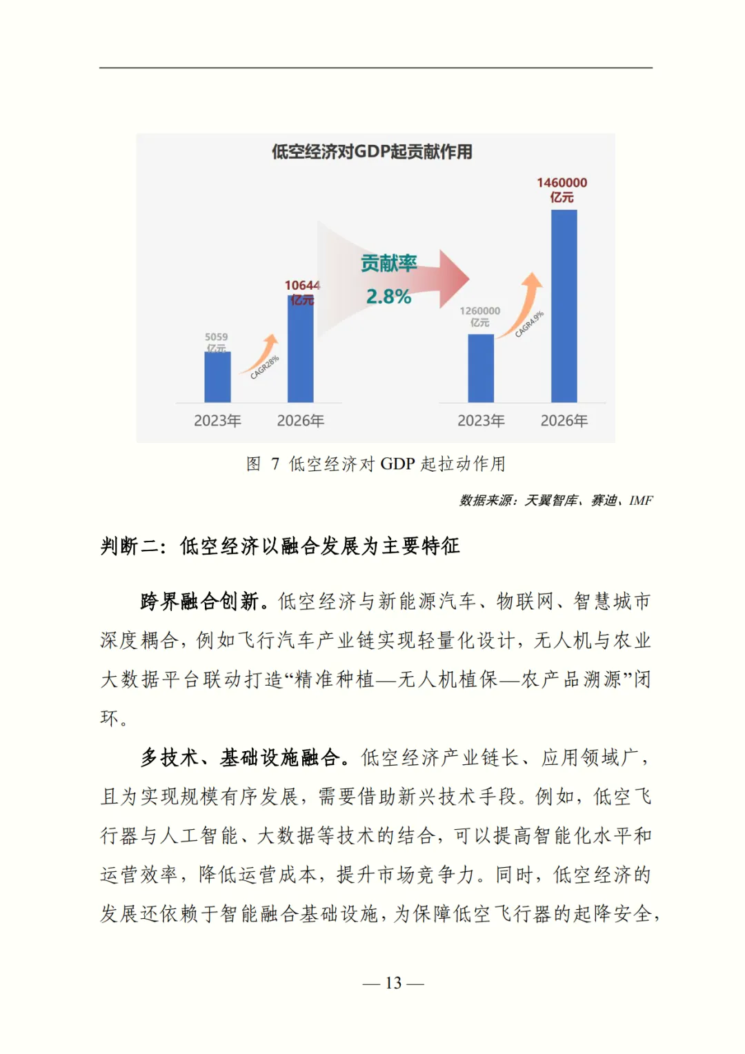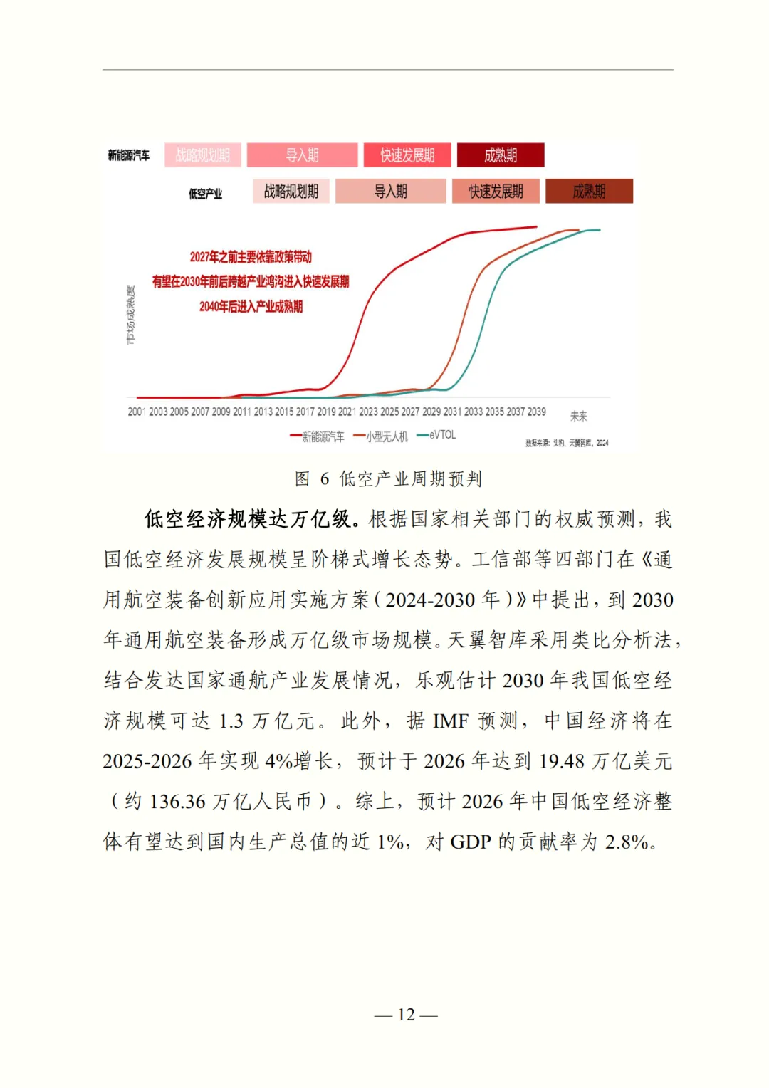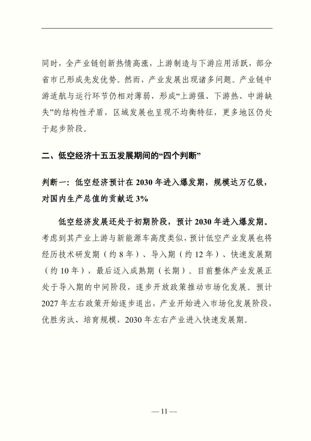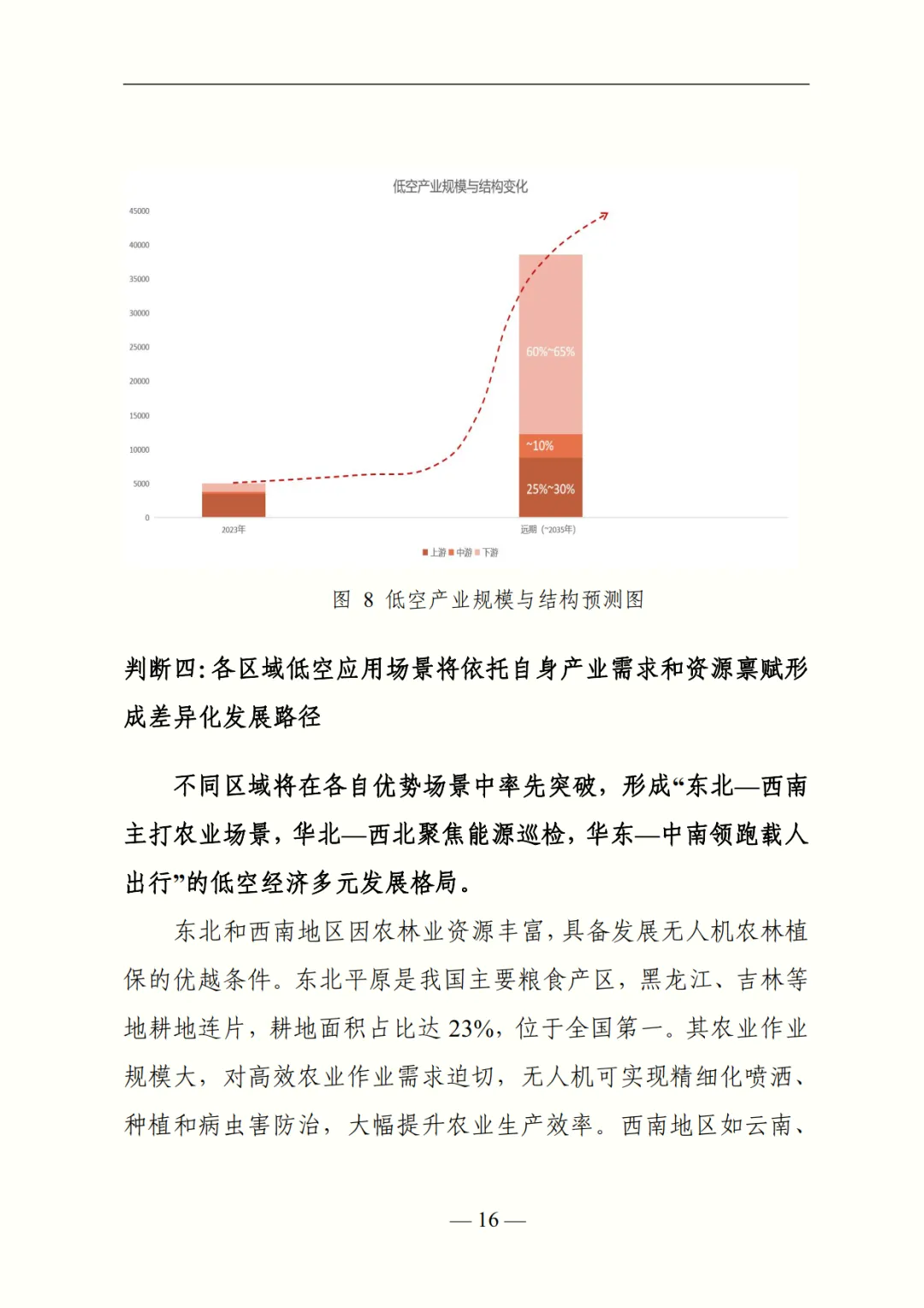 基于现状,报告提出 “十四五” 期间四大核心判断:一是产业周期上,预计 2030 年进入爆发期,2030 年市场规模达万亿级,对 GDP 贡献率近 3%;二是发展特征上,低空经济将与新能源汽车、物联网深度融合,实现技术、基建、空间、产学研 “四维融合”;三是驱动逻辑上,短期由上游制造主导(产值占比 70%),长期价值向下游转移,预计 2035 年下游应用与监管占比超 60%;四是区域路径上,将形成 “东北 - 西南主打农业、华北 - 西北聚焦能源巡检、华东 - 中南领跑载人出行” 的差异化格局。