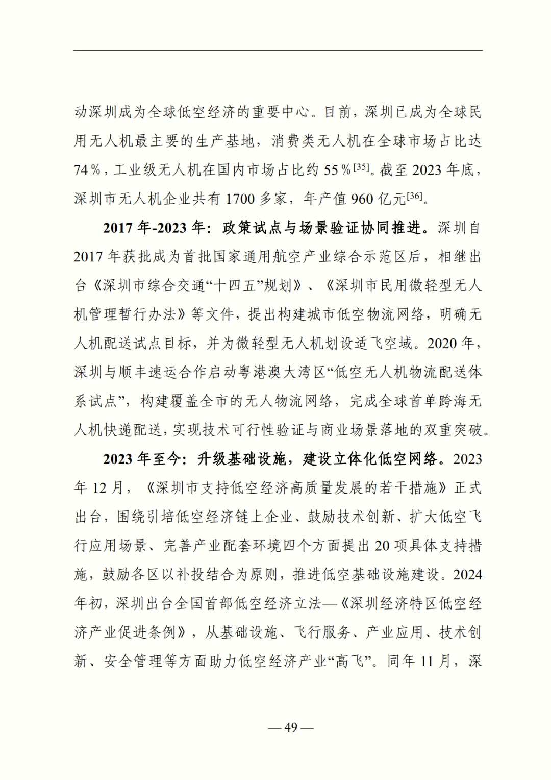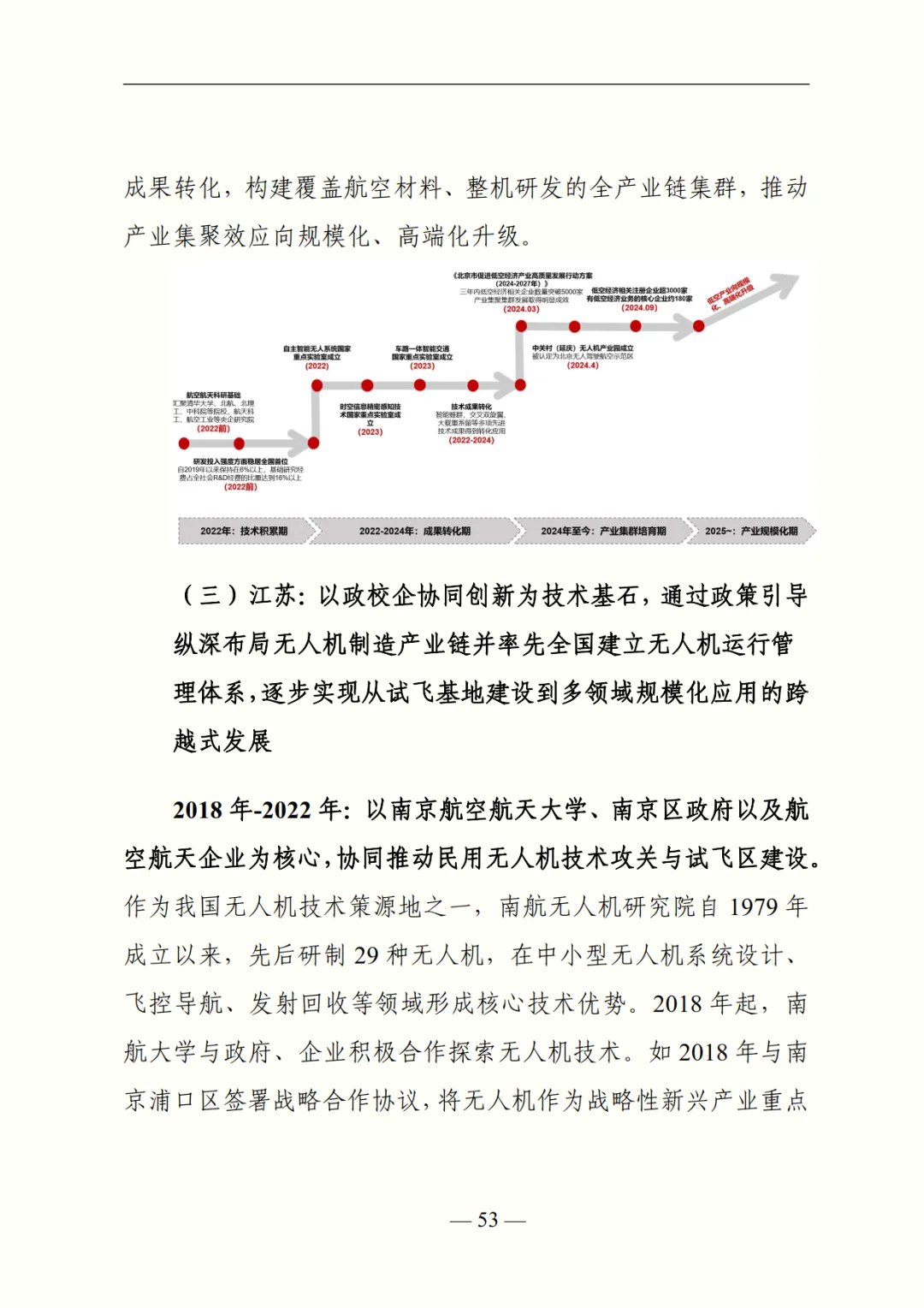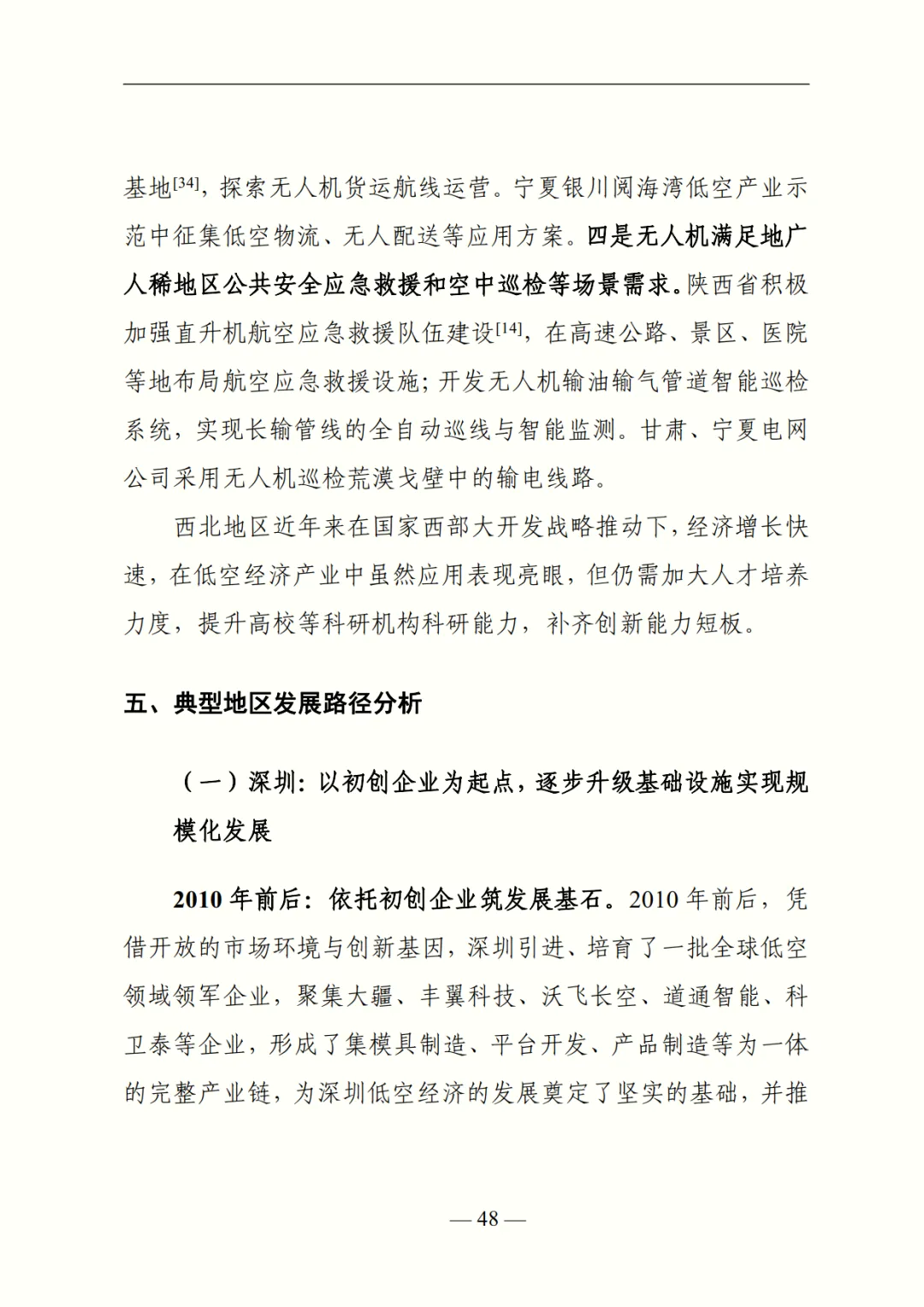 在区域特征与典型路径部分,报告指出华东地区综合能力最强(政策占比超 30%、eVTOL 专利占比 50%),中南地区以广东为核心形成 “一超多强” 格局,华北、西南依托北京、四川辐射带动,东北、西北则分别凭借传统工业基础与空域资源探索特色场景。同时,深度剖析深圳(初创企业驱动 - 基建升级)、北京(科创资源引领 - 全产业链集聚)、江苏(政校企协同 - 智能管理体系)三大典型地区的发展路径,为不同资源禀赋地区提供借鉴。