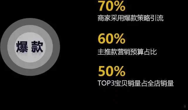 首先让我们看一下这些年我们最熟悉的电商玩法,这就是承接我刚刚说的,最早加入阿里的时候,来到广州的时候来做一些什么事情呢?在2010年的广州的“广货交易会”,当时也叫“阿宝大会”,当时我们的想法是把阿里巴巴B2B的平台和淘宝C2C的平台进行合作,把B2B的商品通过淘宝的方式卖出去,这是我们当时认为最好的方式,2010年的时候我们就做了一次网货交易会,就在我们广州。当时我们最熟悉的方法是什么呢?“爆款”,我相信在座所有的商家看到这两个字眼睛都红了,我们看看后面的数字,7、6、5,是我们70%的商家用了60%的预算去做3%的商品,占到了整个店铺50%的肖像,这是我们最擅长的一个方式,我们想用我们做爆款的方式带动免费的流量,最后促进整个店铺的成交,促进营收率商品的成交,这个方式陪伴我们走过了六七年,然后我们再看看现在。