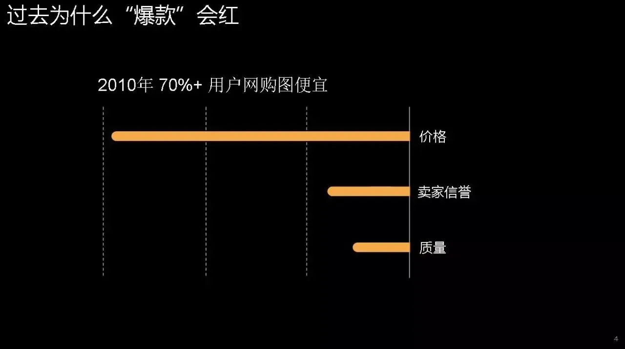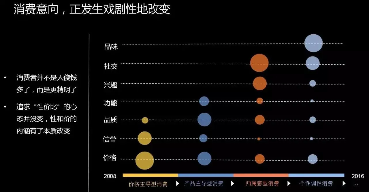看一下它当时为什么会火的原因?从2010年开始大家最关注的一个点是什么?是价格,所以当时所有爆款的点我们都是放在价格上,我们打开淘宝,打开我们的直通车,打开我们钻石展位大部分打爆款都是以性价比打,这个成就了当时淘宝的第一代。我们再看一下纵向的坐标,我们现在面临着一个什么样的社会?我们现在面临一个什么样的市场,我们发现我们的市场已经发生巨大的变化,大家口袋里的钱多了,我来到广州,我今天去要一份早茶,发现钱比2010年提升了30%以上,但是手里的货比2010年有没有提升30%呢?可能没有。但是消费者手里钱多的时候会有什么变化?消费多元化开始了,我们看看中间一个数字,年轻一代的消费者更愿意去花钱,他们愿意为自己的商品付出更多的一些钱,也愿意获得自己更喜欢的一些款式,特别是定制款。