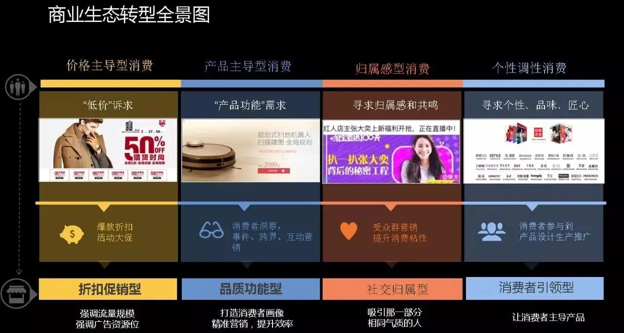 下面一部分是归属感的消费,这是去年最红的一个点,大家多说网红。我们通常去买一件商品的时候我们会通过几种方式获得商品呢?第一个我知道这个商品我去买了,第二个我朋友知道这个商品给我推荐了,第三个我所信任的人,我所关注的一个明星用了,所以我去买了,无外乎这几种。我们发现当我们的朋友圈,当我的社交变成一个普通生活的时候,你会发现第三个属于归属性的消费在去年迎来了一个大的爆发,网红,包括一些意见领袖,甚至包括一些内容型的KOL开始引领整个营销的世界。