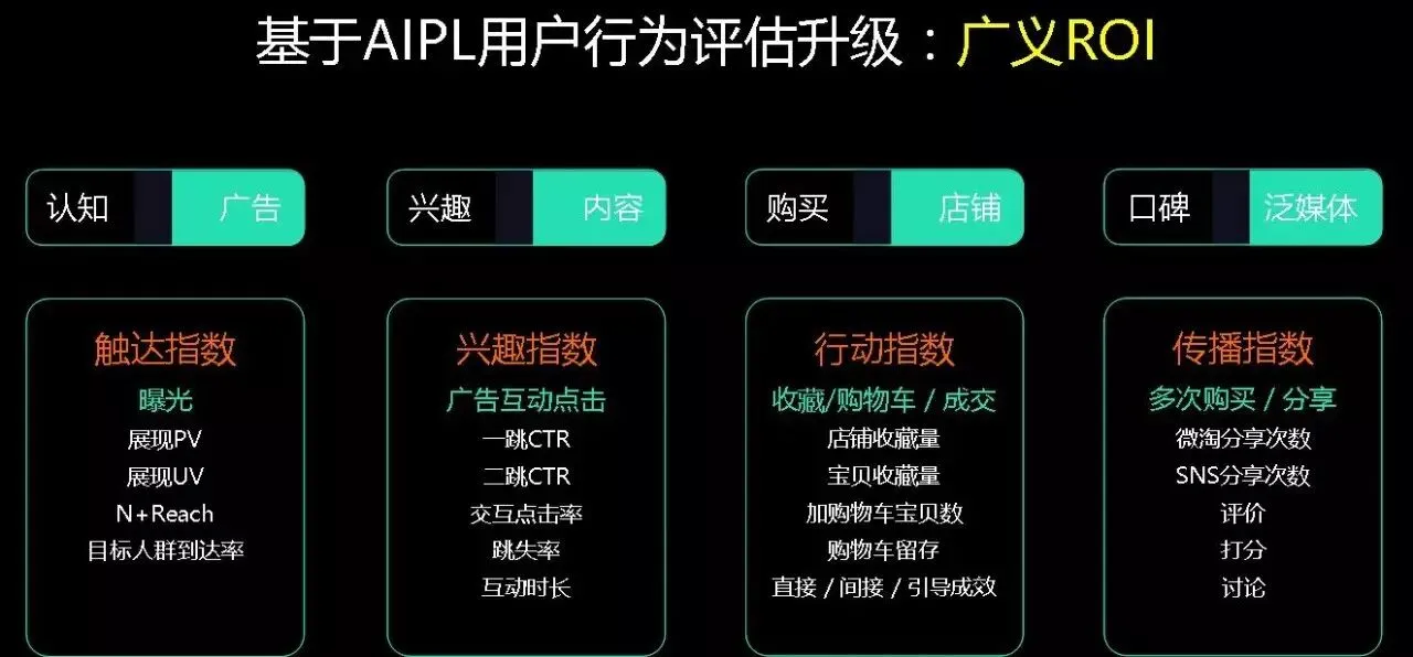 首先讲人,我们做营销的,首先要关注消费者,我们的消费者发生了一些什么样的改变?我们通过什么样方式来了解我们的消费者,我们根据消费者整个链路去做了一个AIPL的模型,主要是通过消费者从兴趣到感知,到后面的购买和成交去做一个全链路的分析。这张图大家应该比较感兴趣,因为上面有一个词就是ROI,做电商谈的最多的就是ROI,但是我们会发现我们在做ROI的时候,其实我们电商讲的ROI和品牌讲的ROI是不一样的。我们讲的电商的ROI是指最后成交的ROI,但是我会发现成交的ROI会制约未来的成长,为什么呢?成交是只看你短期的成长行为,是从你的Campaign角度去看的,但是没有把真正的消费者作为整个链路中的一环,所以我们现在如果要做一个真正的生意就是要看每次营销活动能获得什么样的效果,自己的ROI在什么地方,如果我最近做一次活动,我没有把我们的商品卖出去,但是吸引了很多潜在消费者,吸引了很多用户把我放进了购物车,那是不是一次成功的营销活动呢?我们的答案是“是的”。