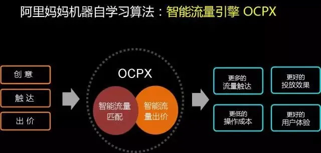 这一块是我们做的智能化,这个概念在去年讲的非常多,OCPX是我们智能化的出价工具。现在对于人工的依赖越来越小了,我们希望把大家营销的时间和经验,包括更多的一些精力做产品的优化,做营销创意的优化,而不是把这些作为一个直通车的投放技巧,钻展的投放技巧,人群分析技巧上,我们是希望大家真正回归到营销的本质,所以我们会有OCPX这样营销智能的工具去解放大家。