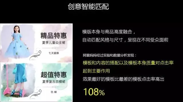 这个就是智能化优化的第二部分,我们当时做了一个判断,我们比较了一下一个效果好的模板和一个效果差的模块,在最后的效果当中可能会差108%。我发现这个好的创意很好,但是我能不能把这个创意更多用到消费者当中呢?你如果通过人工很难做一个适时的调整,今年我们的方向就是把人工智能的方式首先用到大家的创意过程中。我们看一下左边两个图,其实都是机器做出来的,这两个图并不是美工来设计的。第一个是七天退还夏季,第二个是包邮。两个文案不一样,这是机器做出来的,如果消费者对于包邮比较感兴趣,那么我在做创意模板的时候就会把包邮两个字写上去。如果他对售后感兴趣的时候,机器会自动把七天包换这几个关键字替换上去,这就是今年会在创意方面解放大家,把精力放在做产品上,机器会把你推送给应该要推送的人。