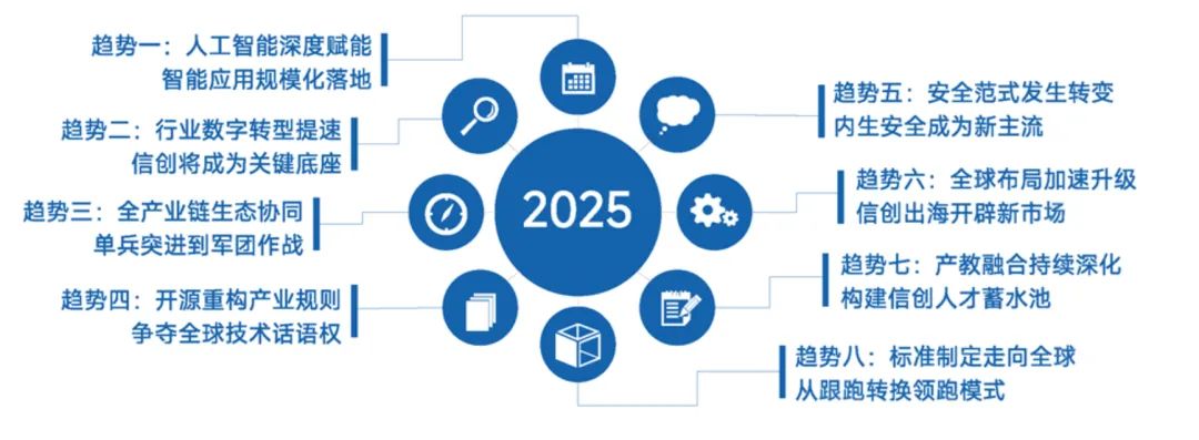 《报告》系统总结了2025年信创软件八大关键趋势:人工智能深度赋能,智能应用规模化落地;行业数字转型提速,信创将成为关键底座;全产业链生态协同,单兵突进到军团作战;开源重构产业规则,争夺全球技术话语权;安全范式发生转变,内生安全成为新主流;全球布局加速升级,信创出海开辟新市场;产教融合持续深化,构建信创人才蓄水池;标准制定走向全球,从跟跑转换领跑模式。