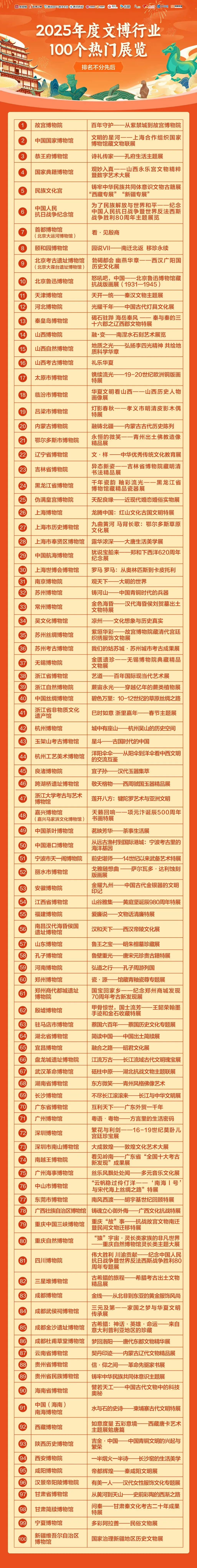 12月31日,由央视频、微博文博、腾讯SSV数字文化实验室、腾讯新闻、中国联通、爱奇艺、优酷、雅昌艺术网、人民文博、文博圈、博展联盟联合发起,全国多家文博机构共同支持打造的2025文博之夜跨年直播大会上,发布了2025年度文博行业100个热门展览。