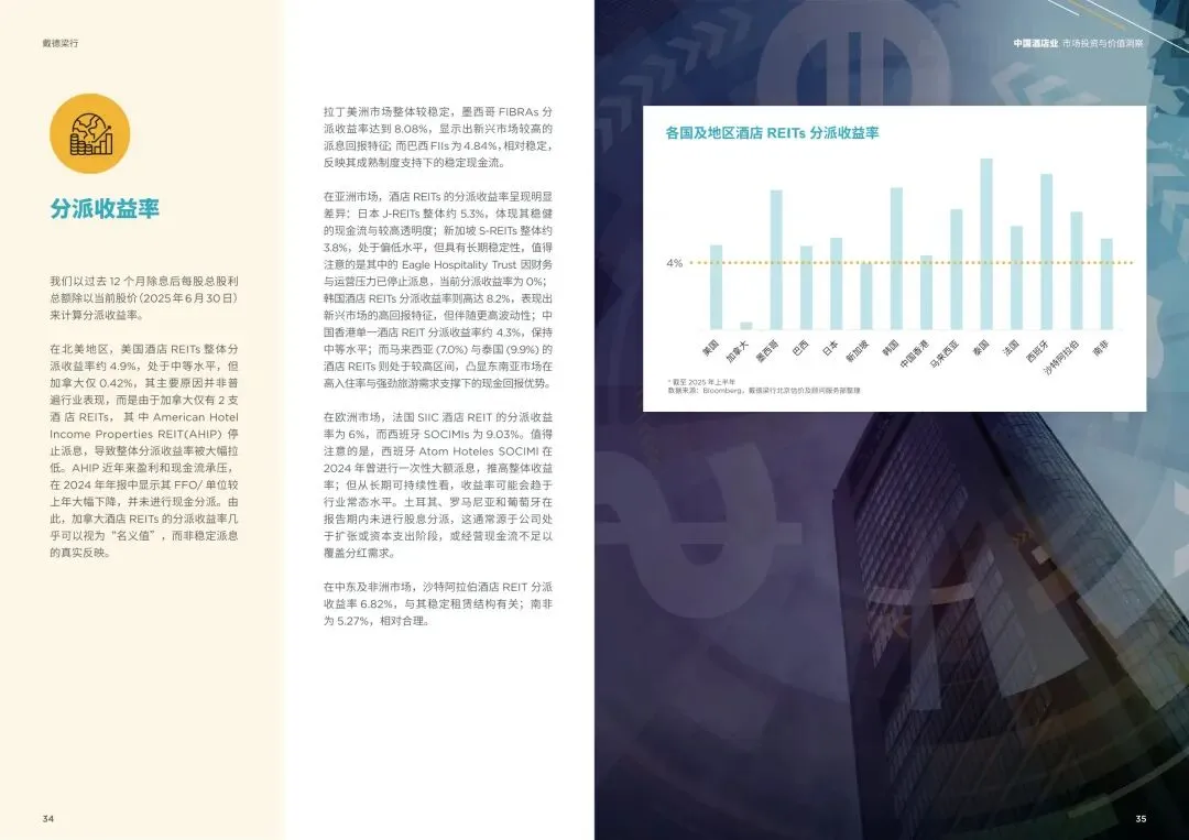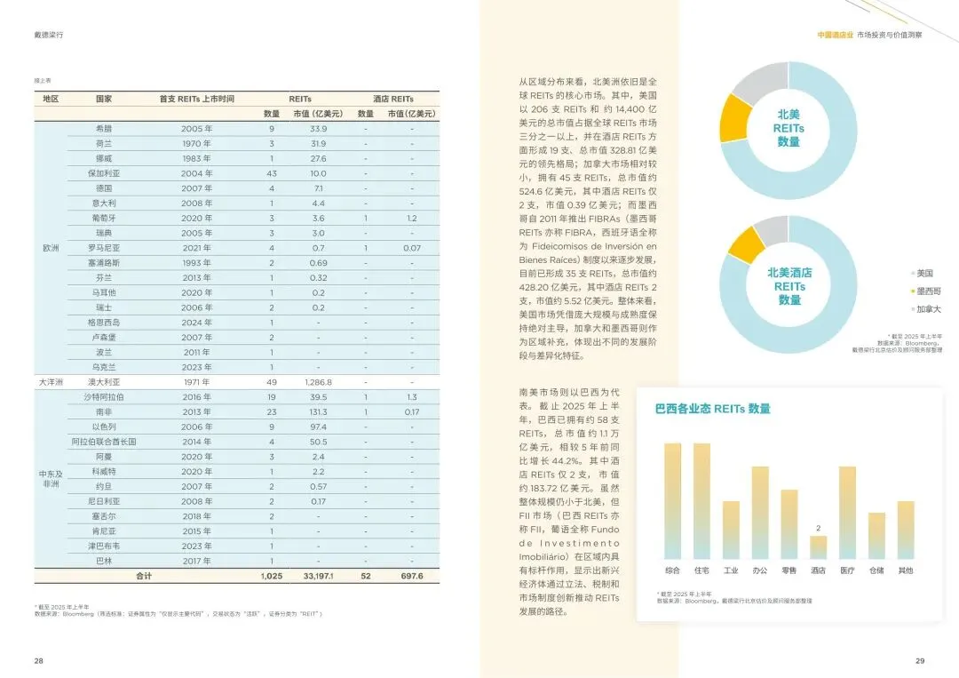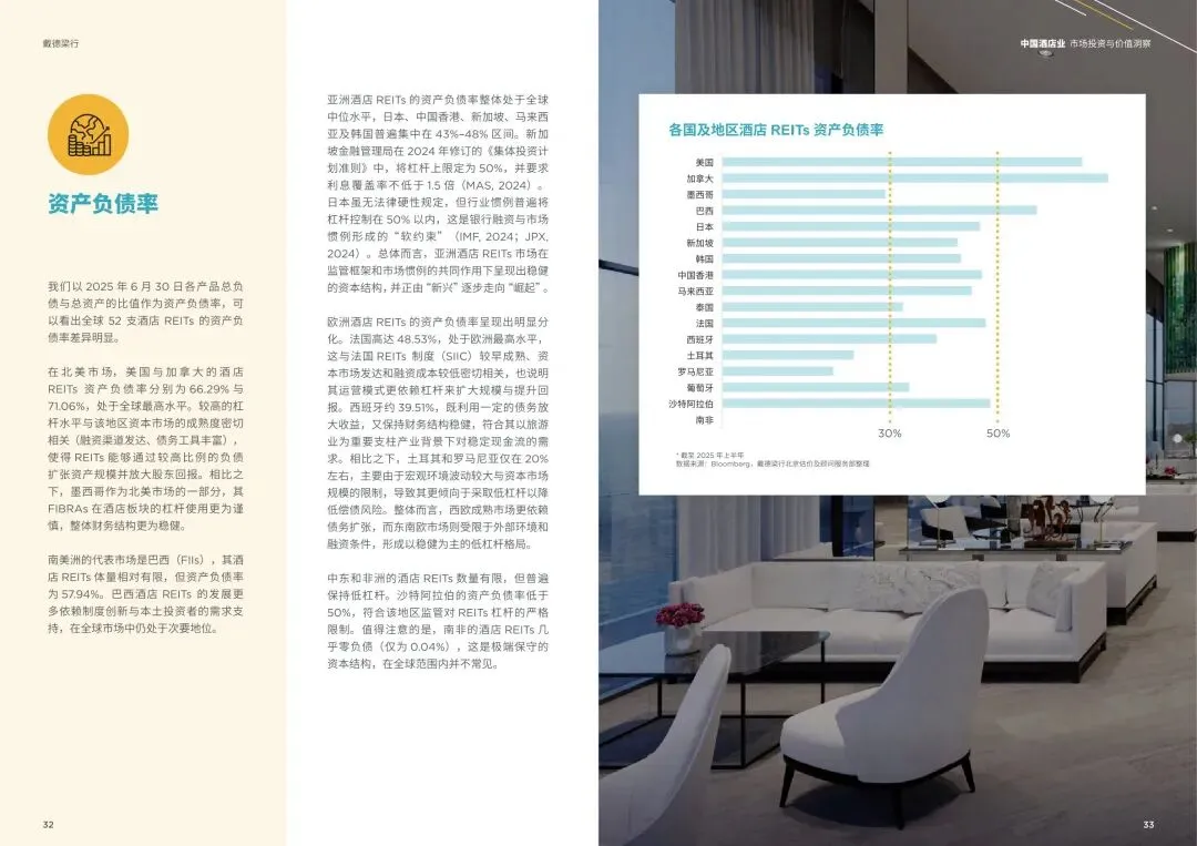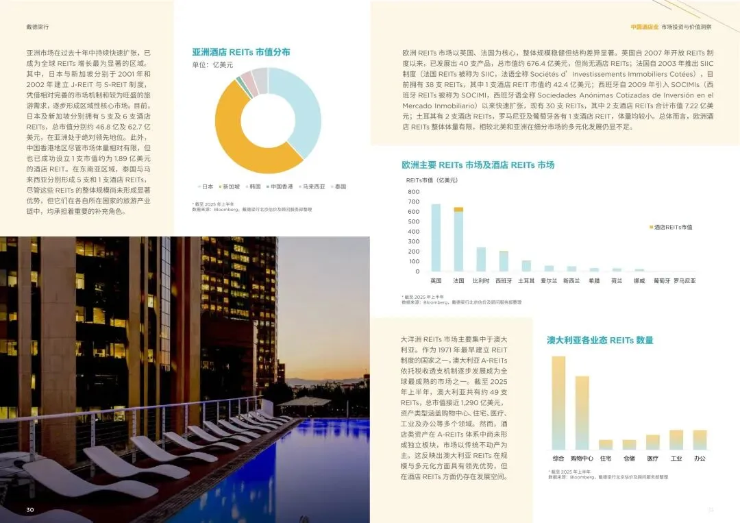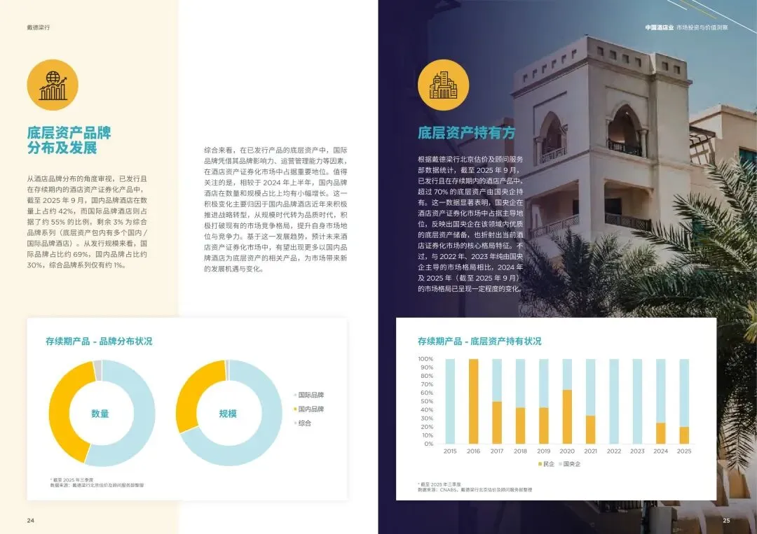 运营市场存量优化,呈现结构化分化特征。截至 2024 年三季度,国内星级酒店 5620 家,呈 “高端少、中端及有限服务多” 结构,高星级酒店数量回落,存量优化成主流。入住率、平均房价、RevPAR 为核心运营指标,三星级酒店入住率表现更具韧性,一线城市五星级酒店恢复速度领先;北京、上海、广州、深圳等核心城市市场稳健,三亚等旅游城市高端酒店保持高房价与入住率。 资产证券化市场扩容,CMBS/CMBN 占主导。截至 2025 年 9 月,存续酒店资产证券化产品 74 支,规模 1168 亿元,CMBS/CMBN 占比 91%,类 REITs 占 9%。发行利率持续下行至 2.33%,底层资产向一线城市集中(46%),国央企持有超 70% 底层资产,债务型融资仍是主流,权益型融资有待公募 REITs 落地突破。 海外 REITs 市场成熟,提供多元参考经验。全球现有 52 支酒店 REITs,北美以美国为核心,亚洲日本、新加坡领跑,欧洲市场相对分散。海外 REITs 多通过多业态、多区域布局分散风险,美国 HST、日本 JHR 等案例显示,稳定的运营现金流与灵活的杠杆管理是收益关键,其资产负债率、分派收益率、市净率呈现区域差异化特征,为国内市场提供参考。 头部品牌集团格局稳定,轻资产与出海成趋势。锦江、华住、首旅三大集团领跑,均以特许经营及管理为主要运营模式(占比超 90%),锦江以 1.34 万家酒店、129 万间客房规模居首。集团收入结构多元,轻资产收益占比显著,亚朵聚焦托管加盟与零售业务形成差异化。头部集团加速出海,锦江境外酒店占比 8.73%,通过并购与本地化布局拓展全球市场。 估值逻辑持续优化,收益法成核心趋势。酒店评估常用比较法、成本法、收益法,收益法因贴合 REITs 核心逻辑与运营实际,逐渐成为主流。评估需综合客房、餐饮等多部门收入与成本,考量委托管理、特许经营等模式下的管理费、许可费等特殊费用。未来评估将更注重 NOI 表现,结合酒店视角与投资视角,推动评估体系规范化、精准化,适配公募市场定价需求。