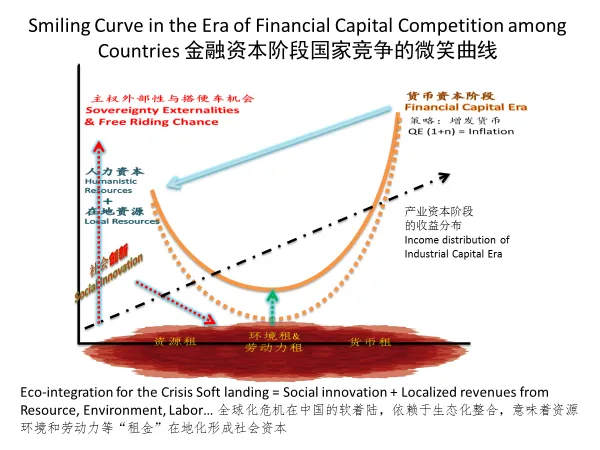三是处于底端的制造业实体经济国家承载了最大化的制度成本;由此,只能靠社会创新提升劳动力租、靠掌握资源主权获取环境租,同时把控国家货币主权获取货币租。这些租资源之所以用暗红色,在于这些潜在能力必须靠积极的制度安排才可以提升制造业国家在微笑曲线中的位势。