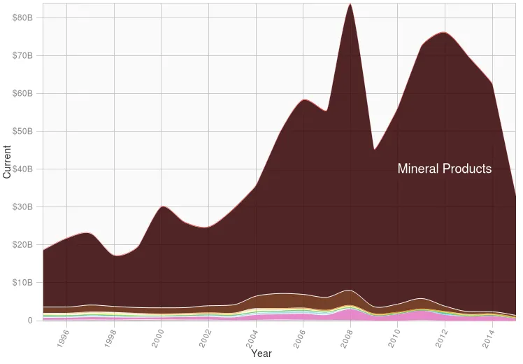 图:委内瑞拉外贸(1995-2015年): 矿产(mineralproducts)占据90%以上