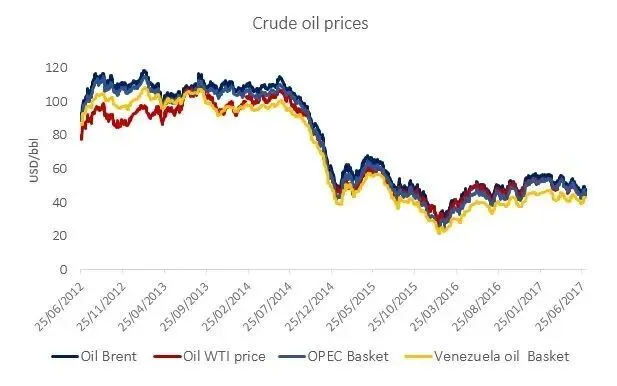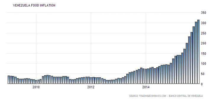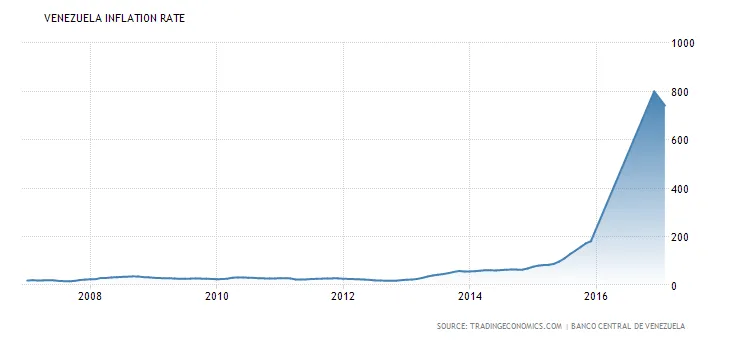 据OPEC数据,委内瑞拉石油收入占出口总收入的95%以上,政府收入一半来源于石油,石油价格自2014年6月约115美元/桶暴跌至2016年11月低于50美元,给委内瑞拉经济带来严重打击,食物、药物等严重短缺,也使2016年12月通胀率高达800%,成为全球通胀最高的国家。截至2017年2月,通胀率为741%。