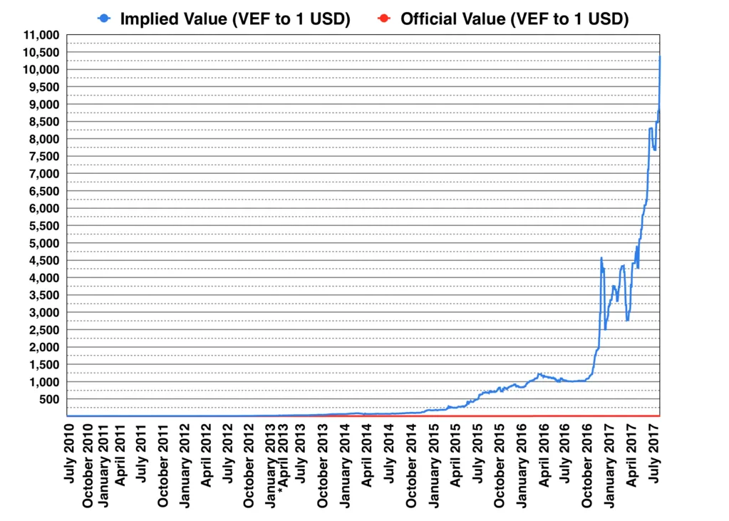 图:委内瑞拉玻利瓦尔兑美元的实际汇价与官方汇率(2010-2017年)
