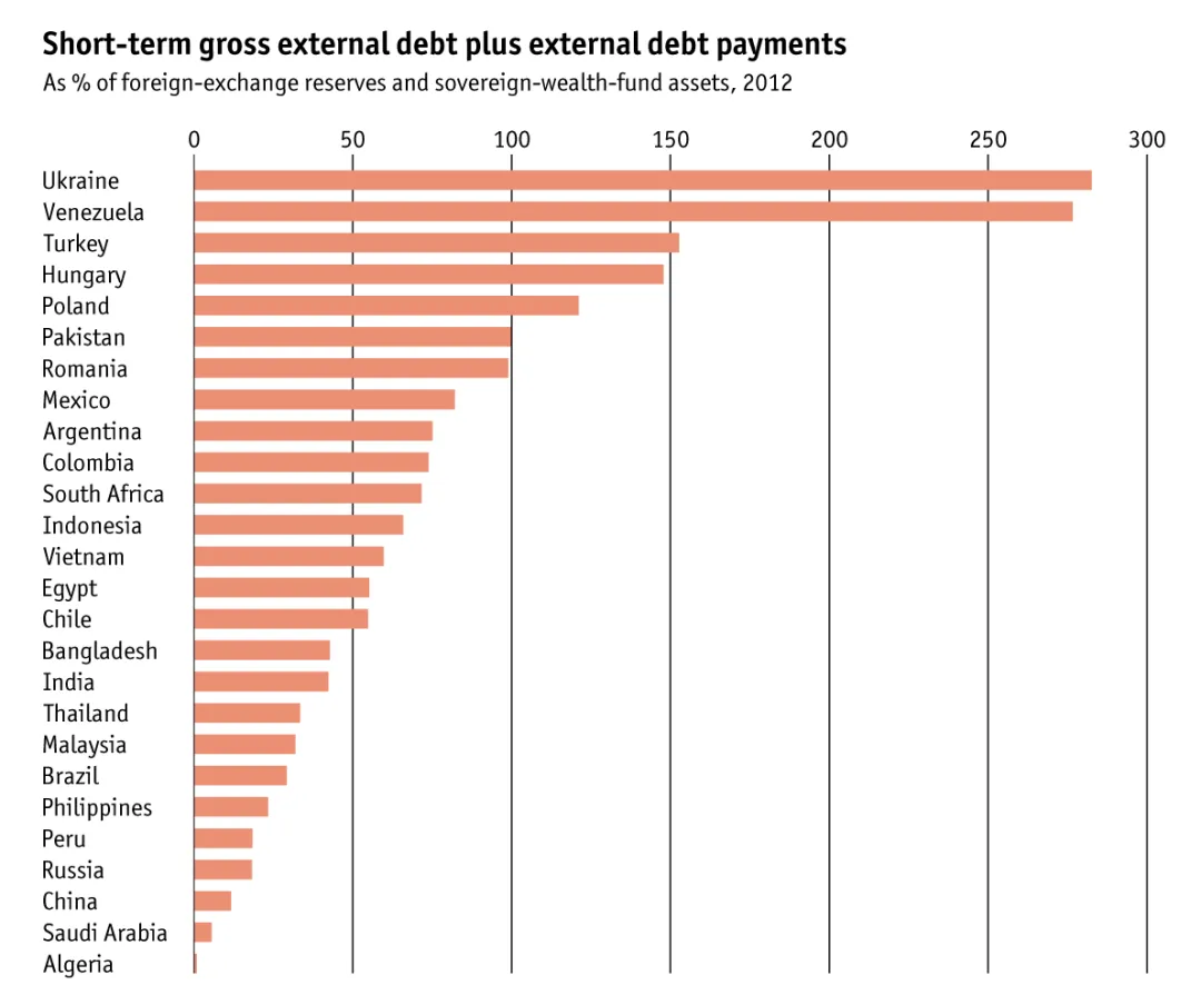 图:2012年短期净外债加外债偿还(占外汇储备及主权基金资产%),E7中委内瑞拉及土耳其均面对较严重外债问题
