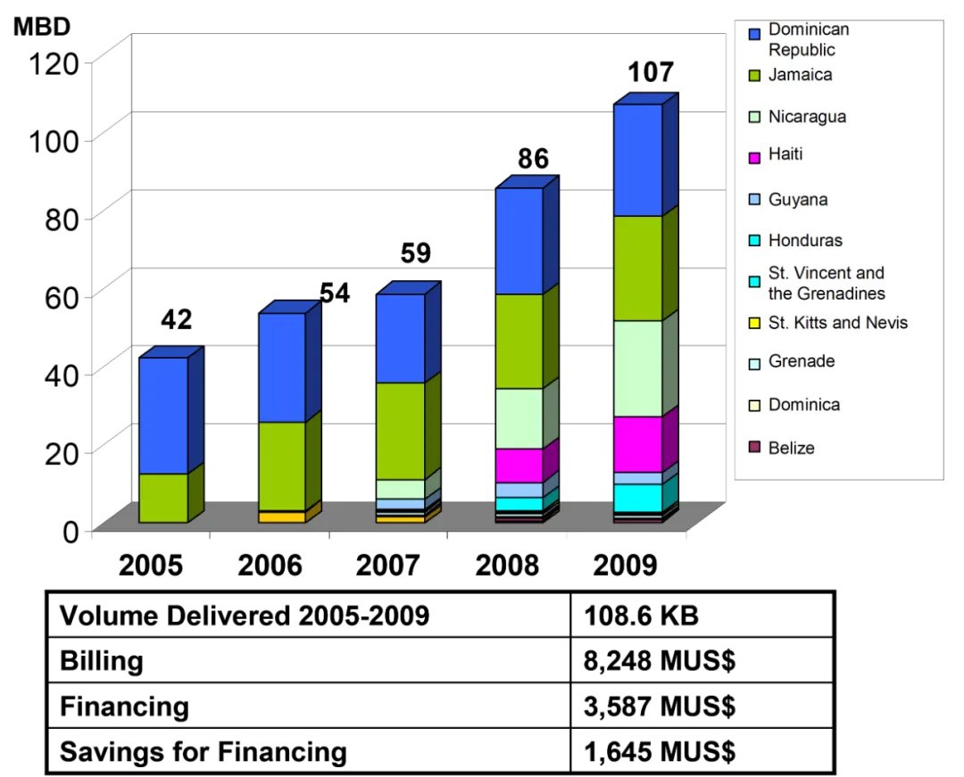 贺双荣根据委内瑞拉国家石油公司(PDVSA)的报告指出,2011年,委内瑞拉每天向该地区的16个国家出口24.35万桶优惠石油,占其官方石油产量的8%左右。这些国家购买委内瑞拉的优惠石油后,前期只需支付5%-50%费用,其余费用的支付有1-2年的宽限期。如果石油价格每桶超过40美元,余款可以在17-25年内偿付,利率只有1%。在加勒比石油计划之下,一些成员国还用货物支付石油进口费用。2011年,尼加拉瓜用牛肉、糖、咖啡、牛奶以及超过1.9万双裤子,支付石油进口费用。多米尼加共和国用糖浆、豆类和食品,圭亚那用大米、萨尔瓦多用咖啡支付石油进口的费用。古巴是加勒比石油计划最大的受益国。通过该计划,委内瑞拉向古巴每天提供9.8万桶优惠石油。古巴以市场价格在国际市场转售来自委内瑞拉的4万桶优惠石油。