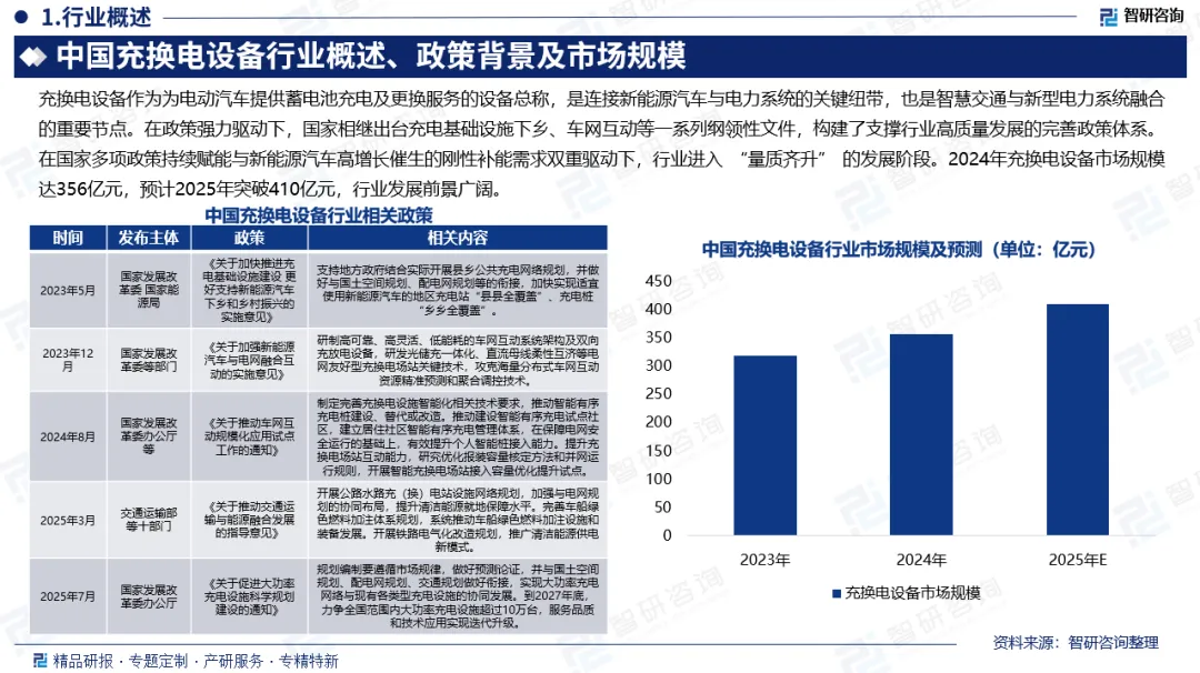 行业概述:充换电设备是为电动汽车提供动力蓄电池充电及更换服务的相关设备总称,不仅包含直接实现补能功能的核心设备,还涵盖保障设备运行的辅助设备与维护设备。而从政策文件的宽泛定义来看,其还可拓展为充、换电设备及其他相关设施的总称,是衔接新能源汽车与电力系统的关键纽带,也是智慧交通与新型电力系统融合的重要节点。