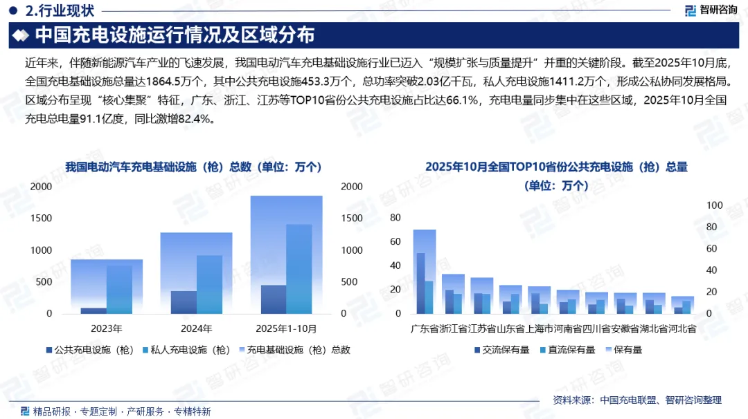 电动汽车充电基础设施建设情况:近年来,伴随新能源汽车产业的飞速发展,我国电动汽车充电基础设施行业已迈入“规模扩张与质量提升”并重的关键阶段。截至2025年10月底,全国充电基础设施(枪)总量已达1864.5万个,同比增长54.0%,呈现公共与私人充电设施协同发展的双轮驱动格局。其中,公共充电设施达453.3万个,同比增长39.5%,总功率突破2.03亿千瓦,单枪平均功率约44.69千瓦;私人充电设施达1411.2万个,同比增长59.4%,报装容量达1.24亿千伏安,成为充电网络的重要组成部分。国家层面出台《电动汽车充电设施服务能力“三年倍增”行动方案(2025—2027年)》,明确提出到2027年建成2800万个充电设施。政策红利持续释放,为充换电设备行业带来强劲的刚性需求。