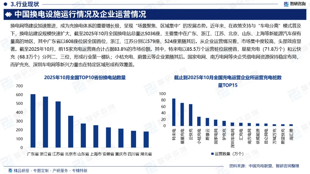 换电站建设情况:换电网络建设加速推进,成为充换电体系的重要增长极,呈现“场景聚焦、区域集中”的发展态势。近年来,在政策支持与“车电分离”模式普及下,换电站建设规模快速扩大,截至2025年10月全国换电站总量达5036座,主要集中在广东、浙江、江苏、北京、山东、上海等新能源汽车保有量高的地区,其中广东省以608座位居全国首位,浙江、江苏分别以579座、524座紧随其后。应用场景上,商用车(出租车、网约车、重卡)因高频补能需求成为换电模式的核心载体,乘用车换电则聚焦高端市场,形成“商乘并举”的布局格局。