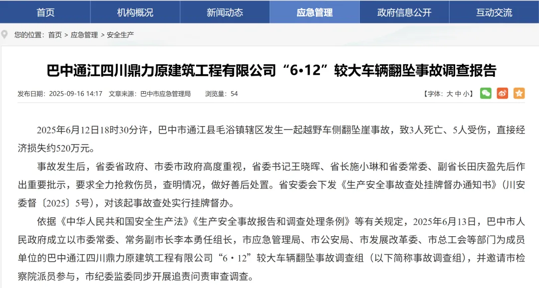 经调查认定:巴中通江四川鼎力原建筑工程有限公司“6·12”较大车辆翻坠事故是一起因肇事驾驶人金X明驾驶渝FDR320号小型普通客车严重超员,行经扬尘视线不佳路段时未及时采取有效应急措施,企业安全生产主体责任落实不到位、属地党委政府及有关部门履职不到位造成的一起场内道路运输安全责任事故。