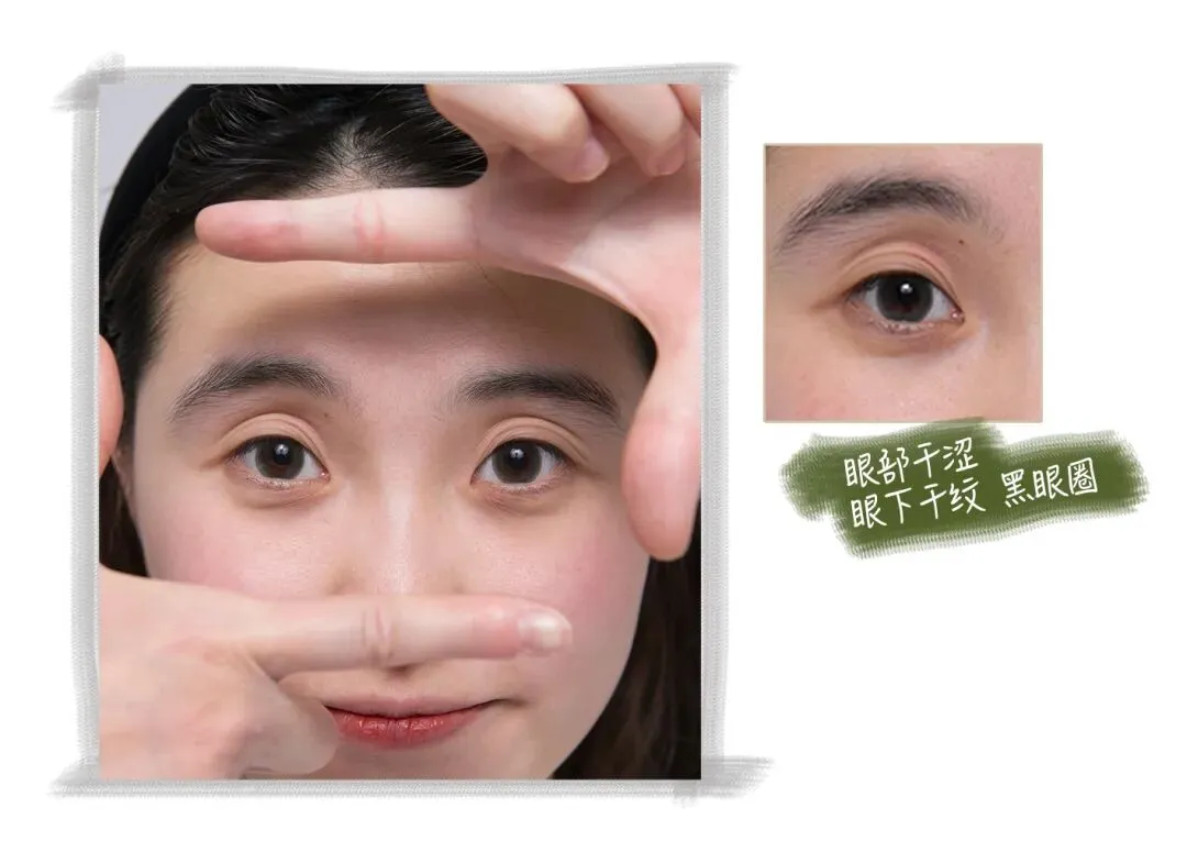 资深失眠选手,导致眼周暗沉,有明显的眼袋、干纹、黑眼圈和泪沟问题,对比面部,眼周老化问题非常突出。