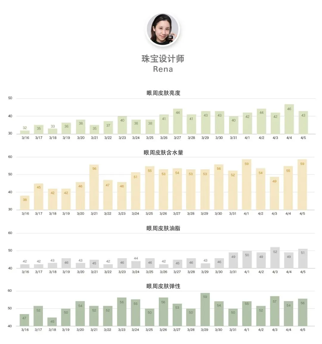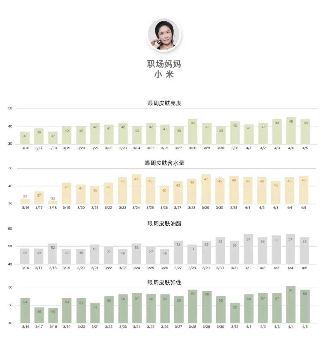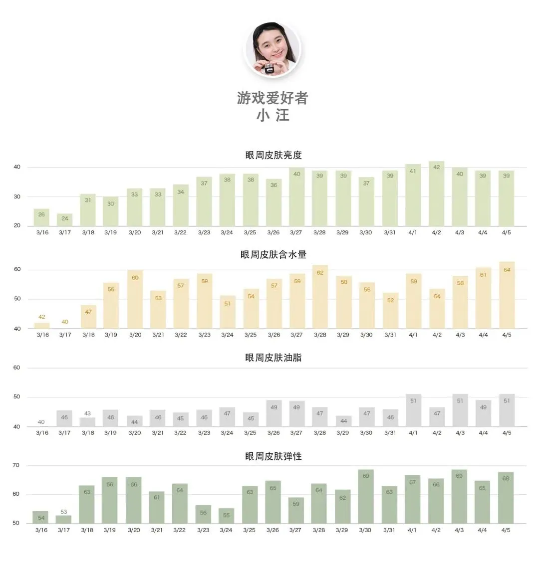 数据层面不仅油分水分都在稳步提升,同时弹性变好了,当然,相对于水分油分和肌肤屏障这些能在短期内立竿见影的效果来说,肌肤弹性因为牵扯到肌肤深层的胶原蛋白和弹性蛋白新生速度没那么快,21天还不足以完全看出这款眼霜抗老回弹的实力,只是初见端倪;所以还是建议大家护肤要坚持,毕竟抗老是一个细水长流的事情啊!