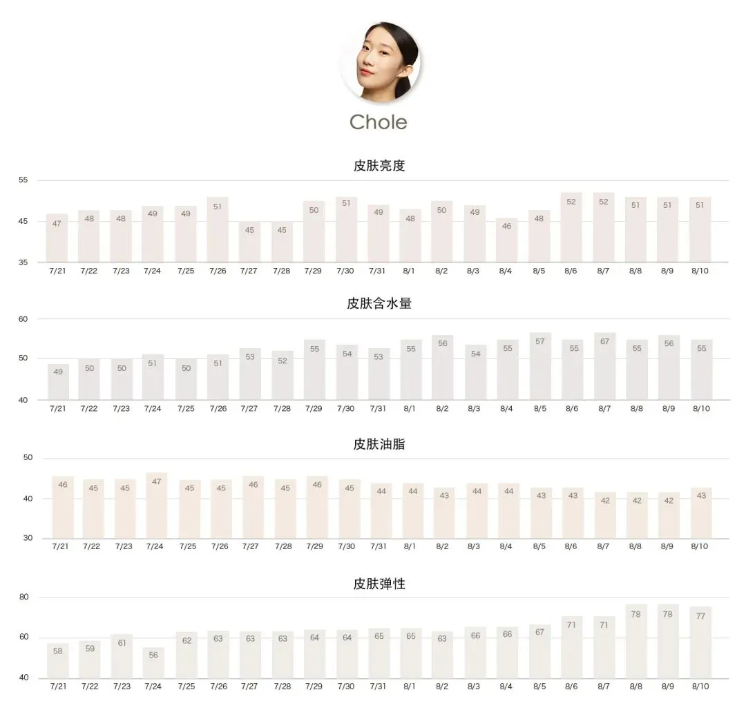 请重点关注水分和弹性两个数据,要知道颈部皮肤非常薄,循环和代谢都很差,几乎锁不住水,因此很多人的颈部肌都有粗糙缺水的问题,老化也更加严重。但从Chole的数据,我们能直观感受到娇韵诗向日葵颈霜在长效滋润保湿方面,以及增厚颈周肌肤,提升弹性方面的卓越功效,同时皮肤亮度也小幅提升,一支淡纹、保湿、提亮,一网打尽颈部肌肤的问题。