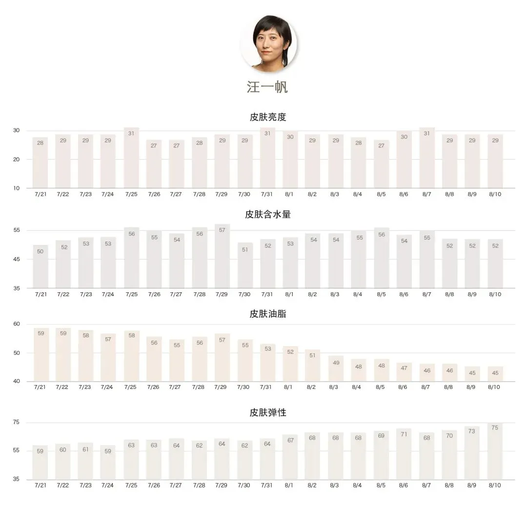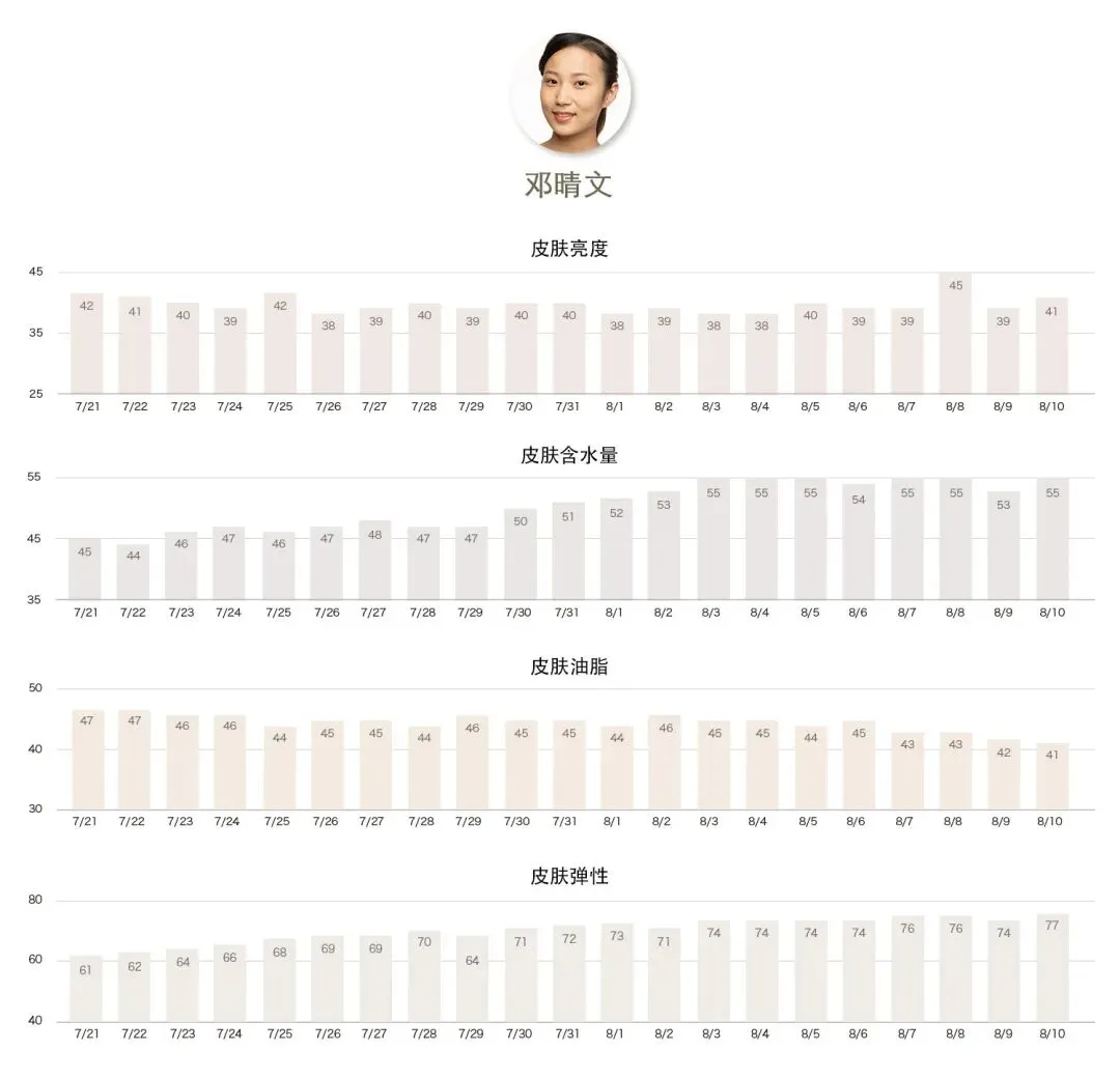 ★ 所有挑战者连续21天、每天5次测试数据并记录,取平均值作为当日肌肤数据。