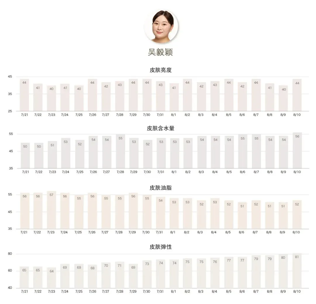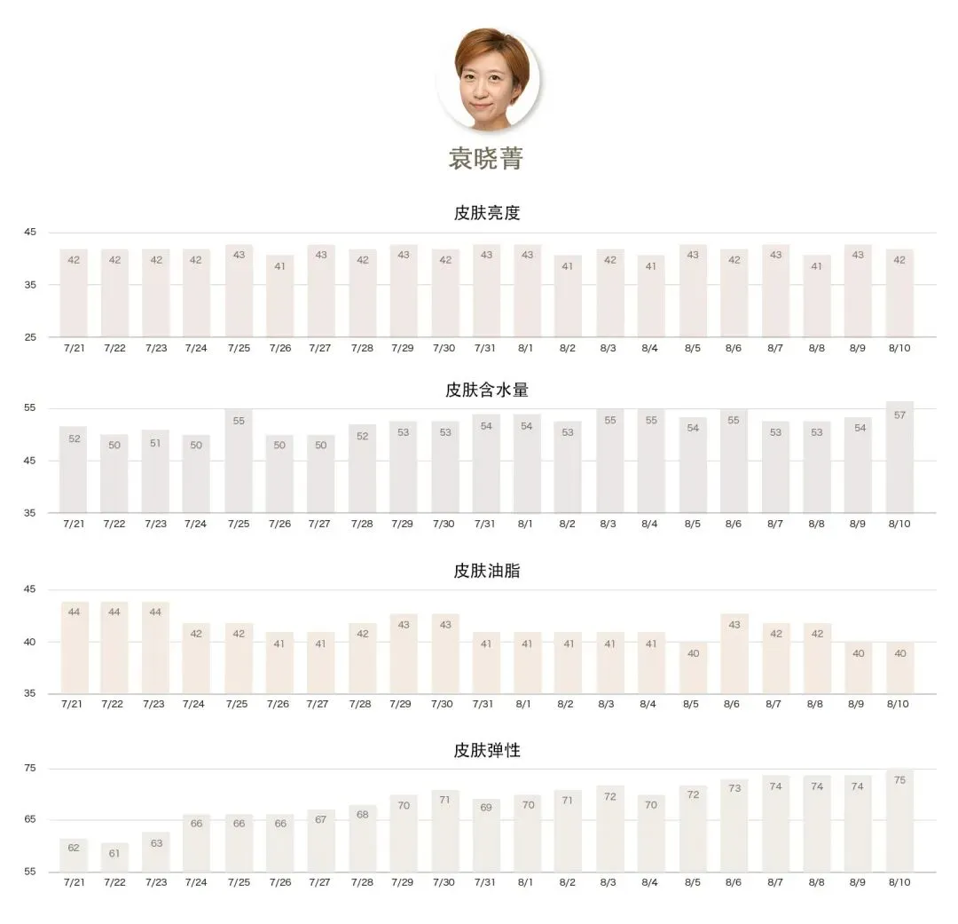 袁晓菁的皮肤弹性这块的变化是五位中最大的,这和她日常坚持按摩不无关系。果然好的产品配合正确的按摩,就如同如虎添翼一般令效果加乘。弹性数据竟然获得了13的提升幅度,这在涂抹级的护肤品来说非常难得,同时,颈纹也真的变少、变浅了。大家有时间不妨借鉴晓菁的做法,定期为颈部做SPA,紧致、淡纹、提亮的同时也是一个很好的放松颈部,舒缓疲劳的方式。