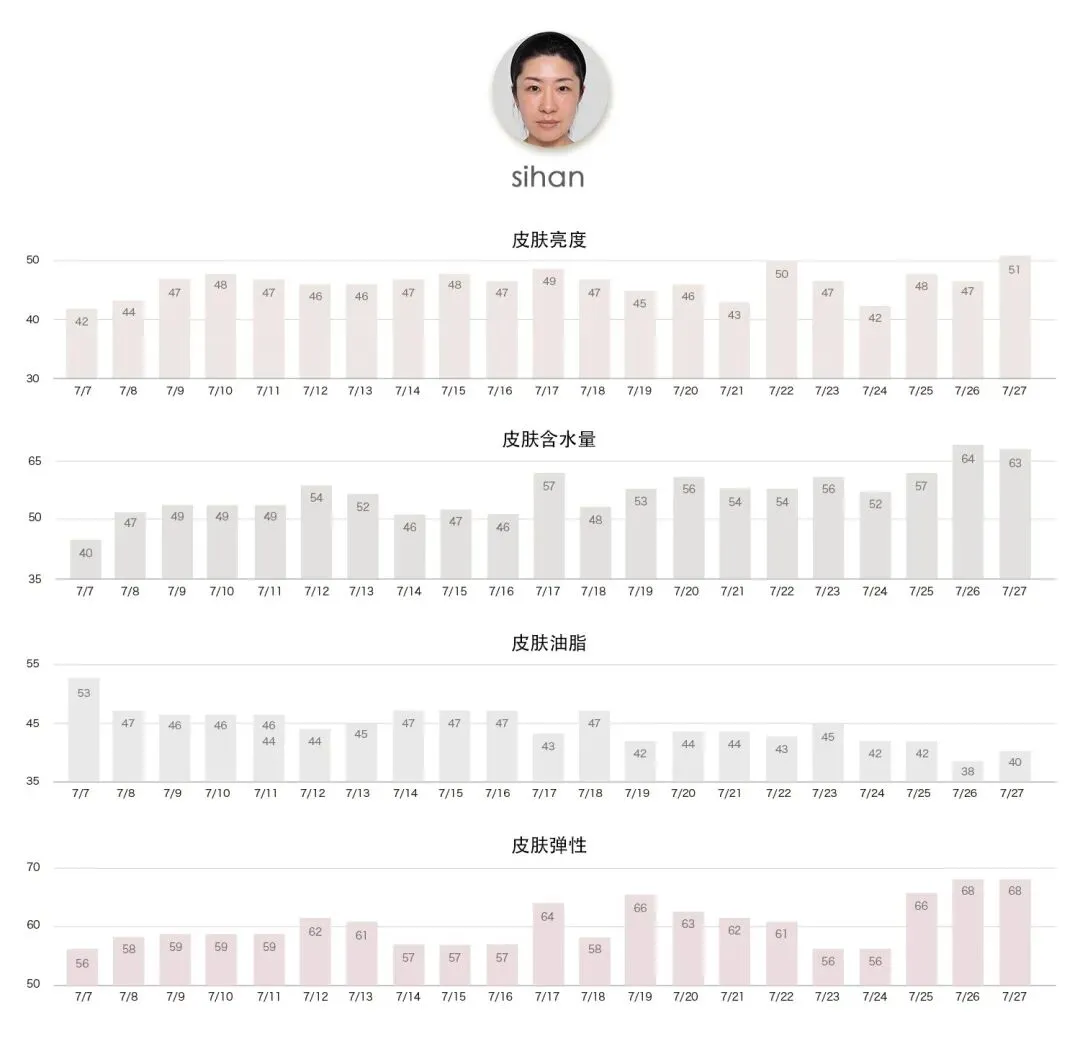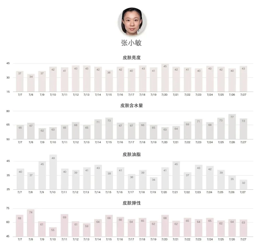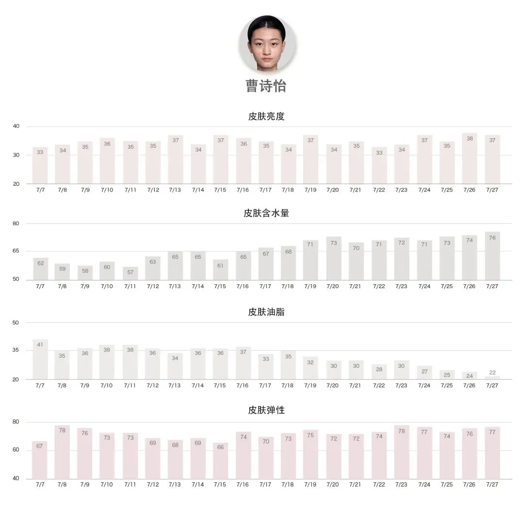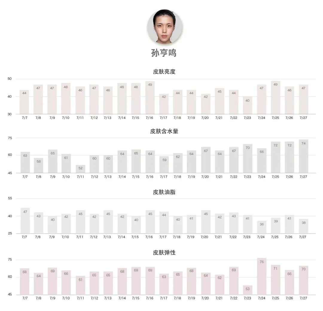 数据层面的变化非常有意思,整体数据无论是皮肤亮度、水分、油脂还是弹性,整体都呈现转好趋势。但不难发现,在7/17当日出现了一个“坠崖式”的下滑,了解到这是由于孙不仅白天去迪士尼暴晒了一天,夜晚还组了烧烤啤酒局,熬了次大夜,导致所有指标都出现明显下滑。但我们也要注意到,当肌底处于一个健康环境,皮肤吸收通道被打开以后,肌肤的自愈力是很能发挥作用的,所以虽然17号数据爆表,但很快所有指标不仅恢复更稳步提升,这里面,能够改善肤质肤色肤感,让皮肤变得细腻、强韧、均匀、透亮的OLAY流光瓶功不可没。