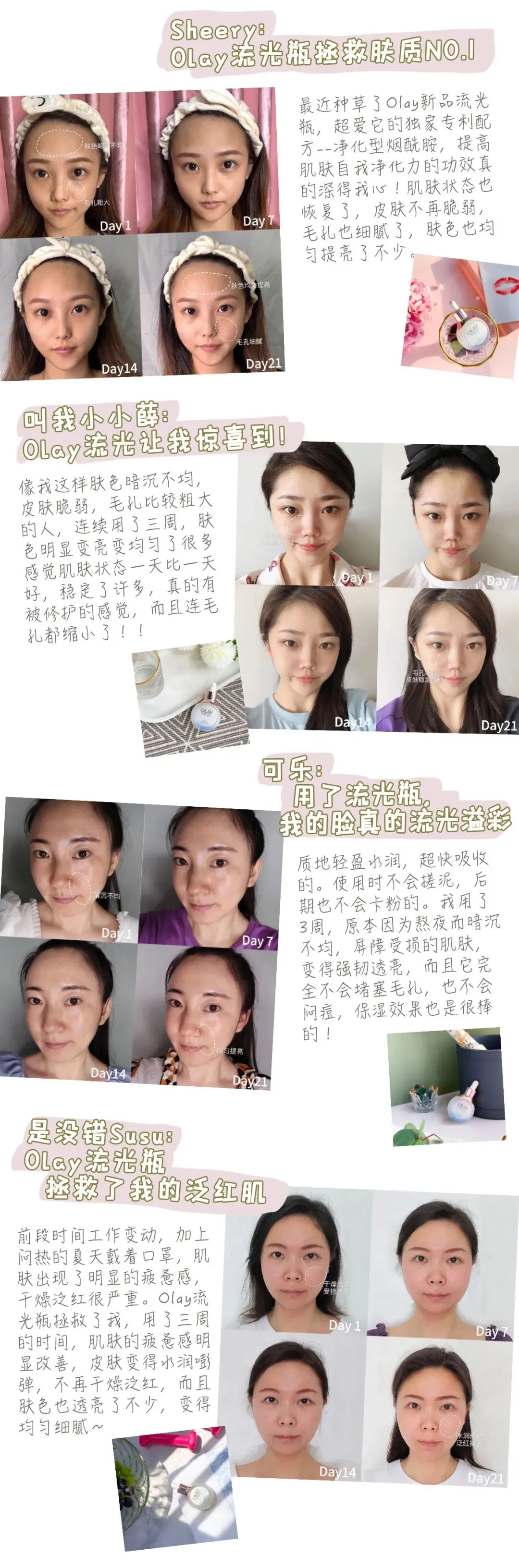 5位挑战者之外,我还邀请小茂帮8位课代表试用OLAY流光瓶21天,并且记录了皮肤变化。以下精选4位的使用心得: