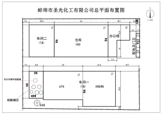 2023年1月4日12时18分,蚌埠市圣光化工有限公司罐区发生混酸(硫酸93%、含少量硝酸)泄漏事故,大量棕黄色烟雾从罐顶人孔冒出,部分混酸流入罐区围堰外的厂区水沟内。事故未造成人员伤亡,造成直接经济损失约5万元。