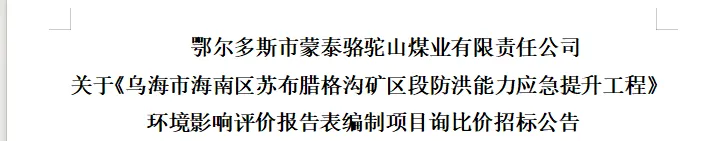2、标的物:鄂尔多斯市蒙泰骆驼山煤业有限责任公司关于《乌海市海南区苏布腊格沟矿区段防洪能力应急提升工程》环境影响评价报告表编制项目(招标编号:ZB-MTLTS-2026-1-4)。