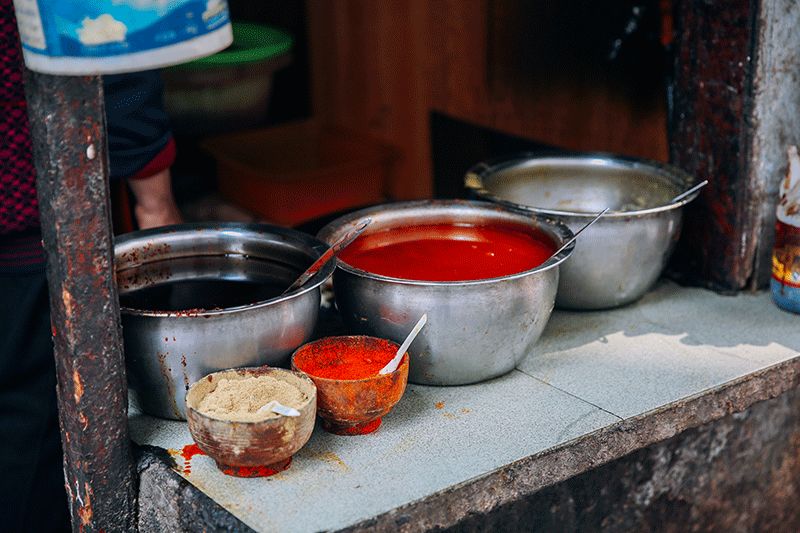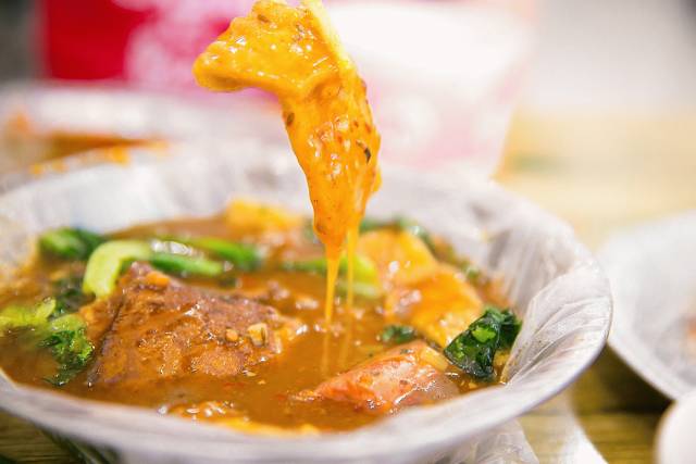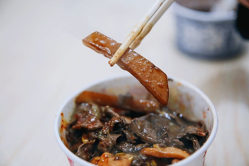 可选的食材就那么几样,豆腐、干子、肉筋、藕、鸡爪……每一样都是经典。最吸引人的还是她家的酱,孜然味,甜醋味,香辣味三种酱汁可选,甜的和辣的酱拌在一起味道最特别。吃炸炸的时候,配一碗绿豆汤就更棒了。