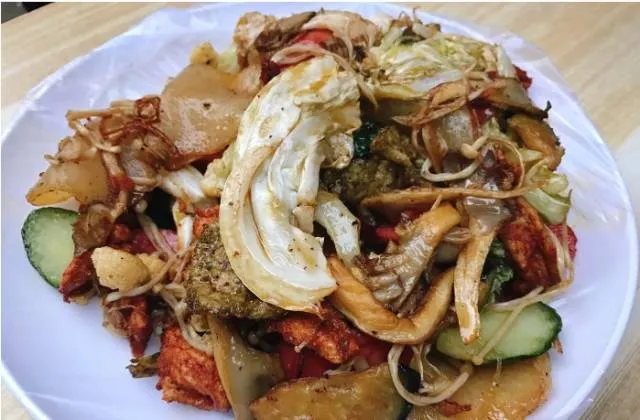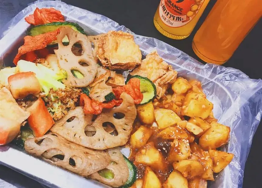 制作方法:食材有土豆片,黄瓜、藕片,包菜,豆角,热狗和鸡块等,大部分食材以散炸为主,荤素食材在油锅里滚一圈,滋滋作响,香气立刻弥漫开来。接着刷上秘制酱料,装盘上桌。