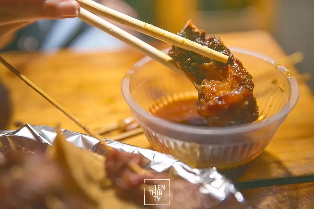 炸肉串的话,推荐猪肉串,裹了少许孜然,非常香嫩。还有炸鱿鱼,炸鸡翅和牛肉,牛肉裹了淀粉之后炸的很酥软。素菜推荐特色炸四季豆和扁豆,每个品种还有不同的蘸酱,茄子蘸酱不能更美味。
