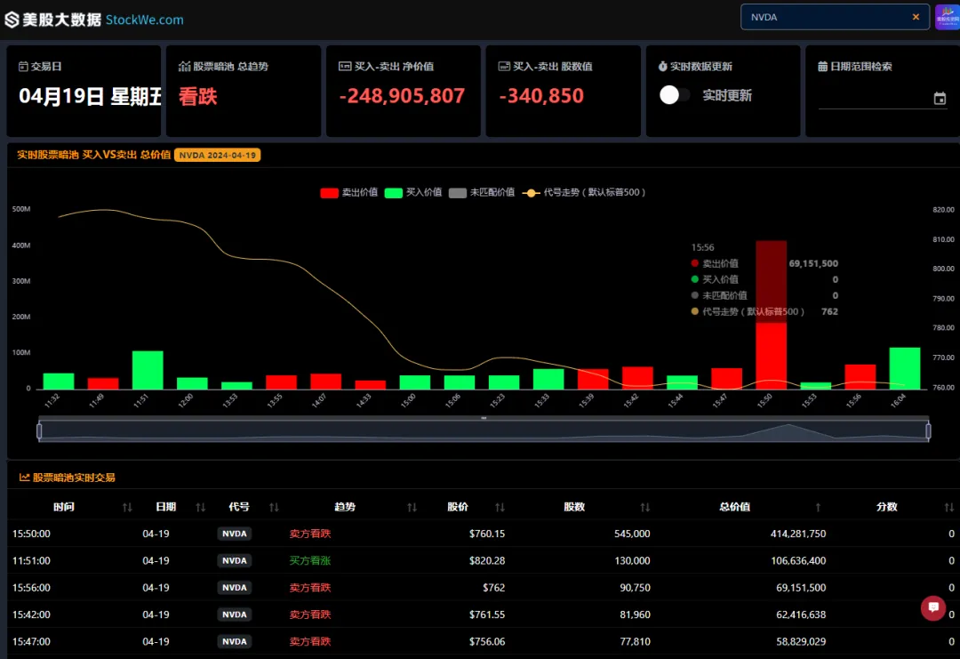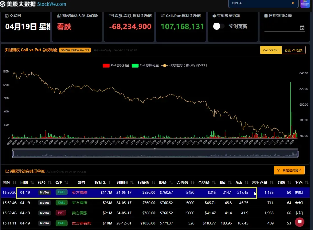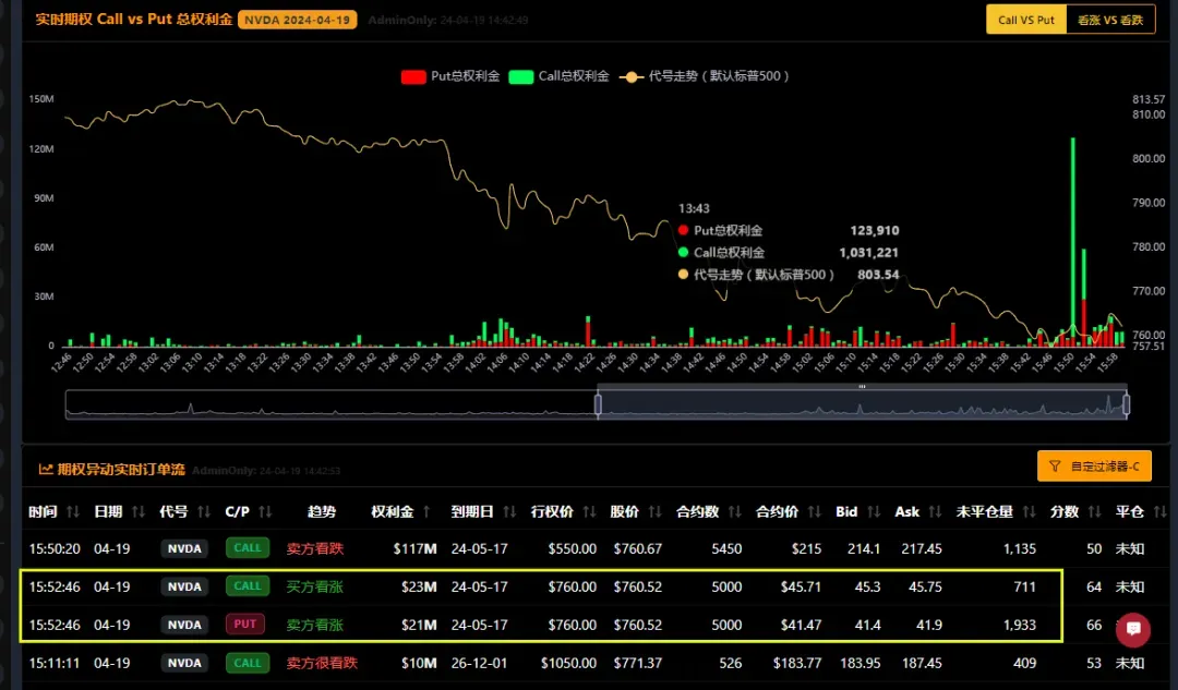 而另外一位机构交易员,采取不同的策略,买入下个月的看涨期权CALL,并卖出同一个到期日5月17日,同一个行权价760美元的看跌期权PUT,合约数量都是5000个,分别花了2300万美元和拿回来2100万美元,这也很明显是做了一个期权组合,同一个时间开仓的,而这位机构交易员,对应英伟达的预判是后市看涨,今天是跌出了绝佳的炒底机会。