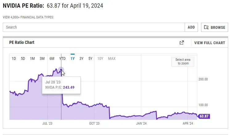 从当前的估值趋势来看,英伟达的市盈率(PE)已经从2023年7月的高点243.49显著下降至2024年4月19日的63.87。