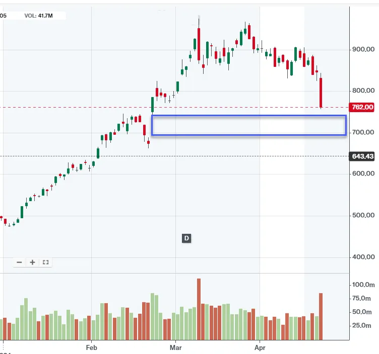接下来,我们要特别关注的一个重要支撑价位区间是738的跳空缺口支撑位置。这个区间之所以重要,一方面是因为在2月份时,财报利好的一个跳空的位置,是最近一个获利盘的筹码密集区,机构不会想让做空的人打压跌低于这个位置