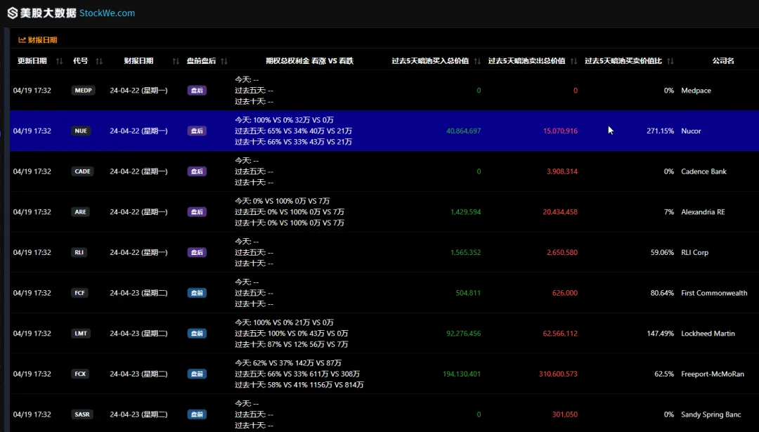 和往常一样,我们美股大数据都会提前给每个财报的公司,统计出最近的机构期权大单,看涨和看跌的比例,以及机构买入和卖出的比例,让大家清楚了解华尔街全部机构,他们是怎么真金白银下单的。